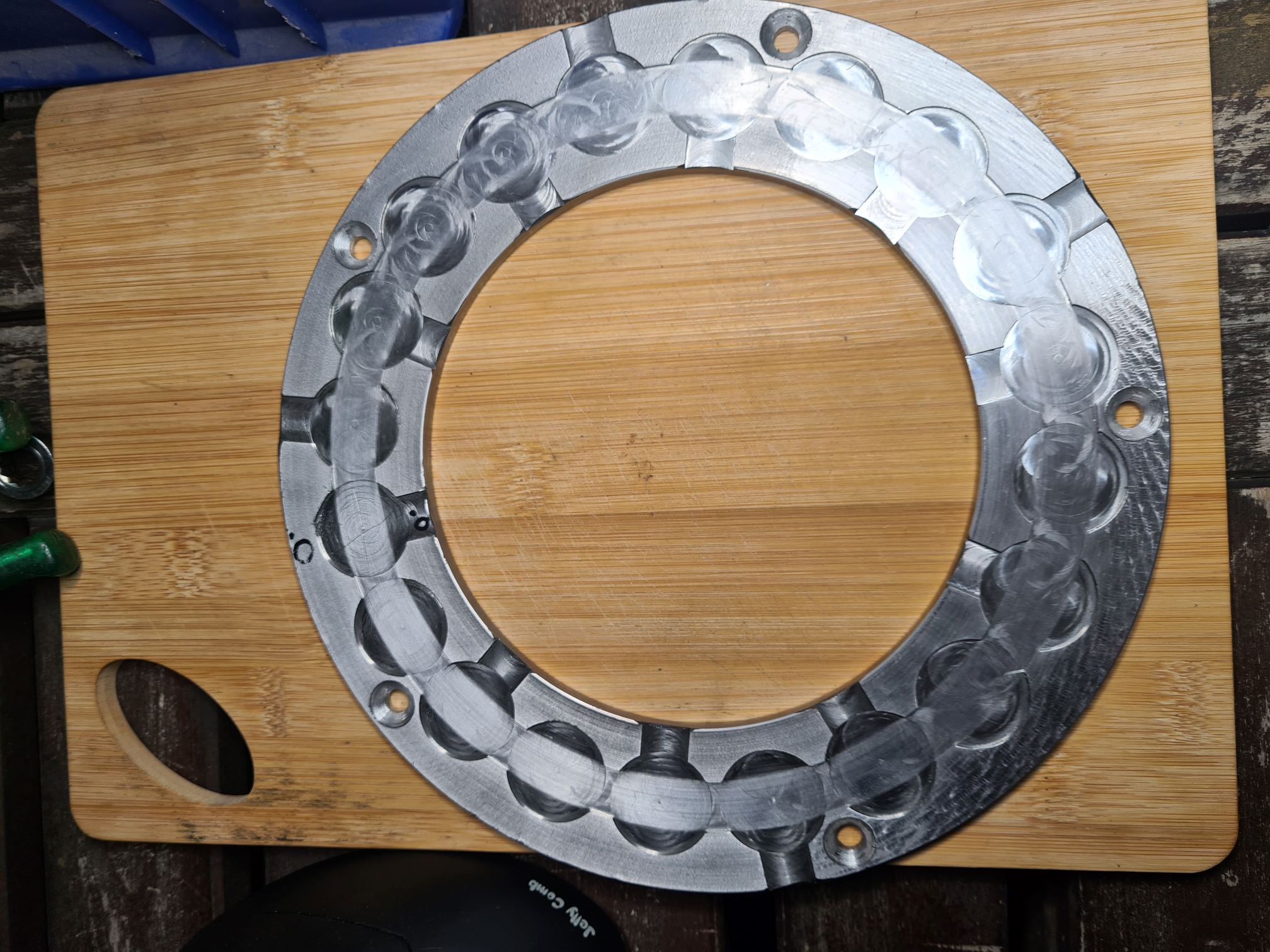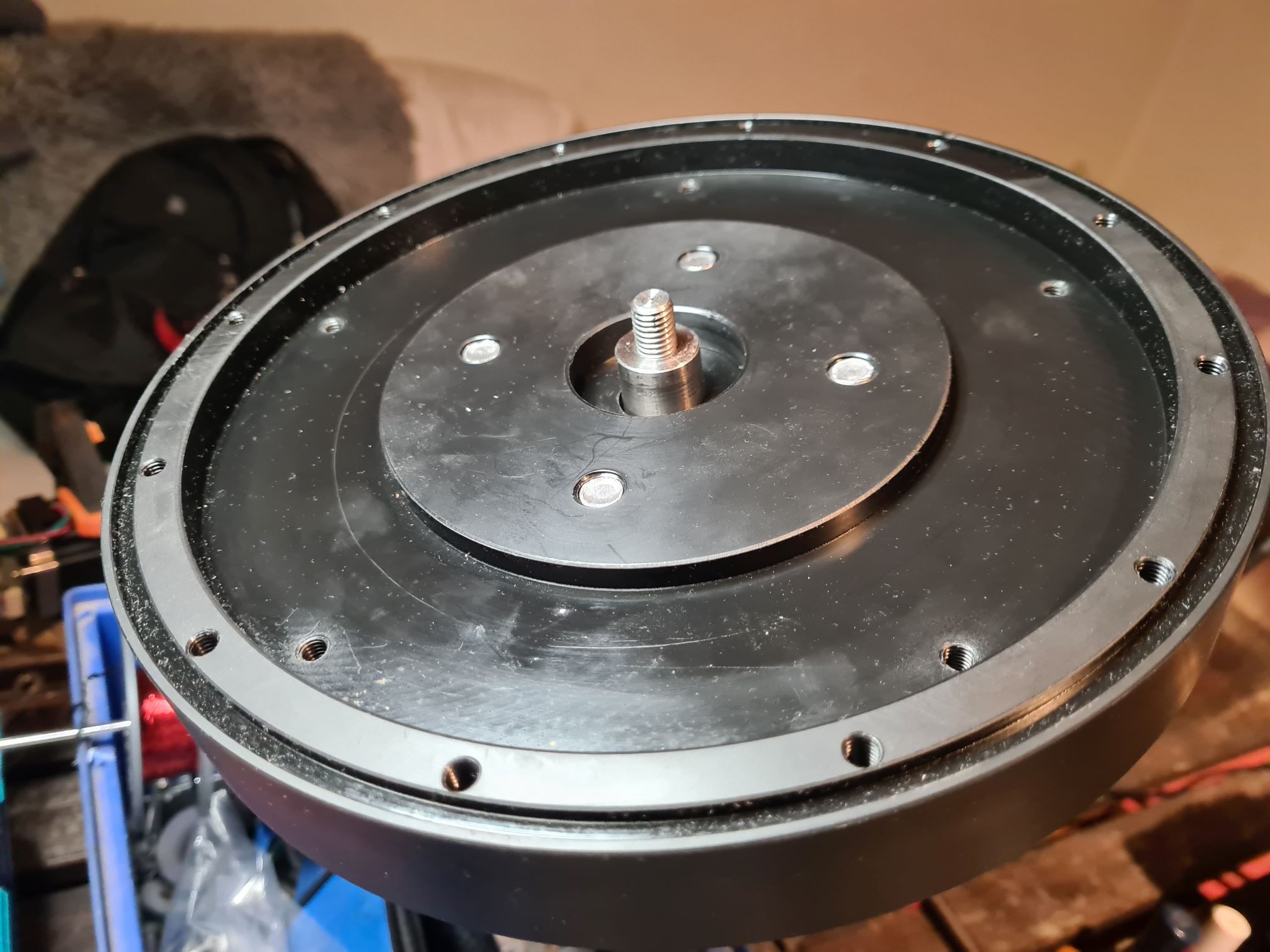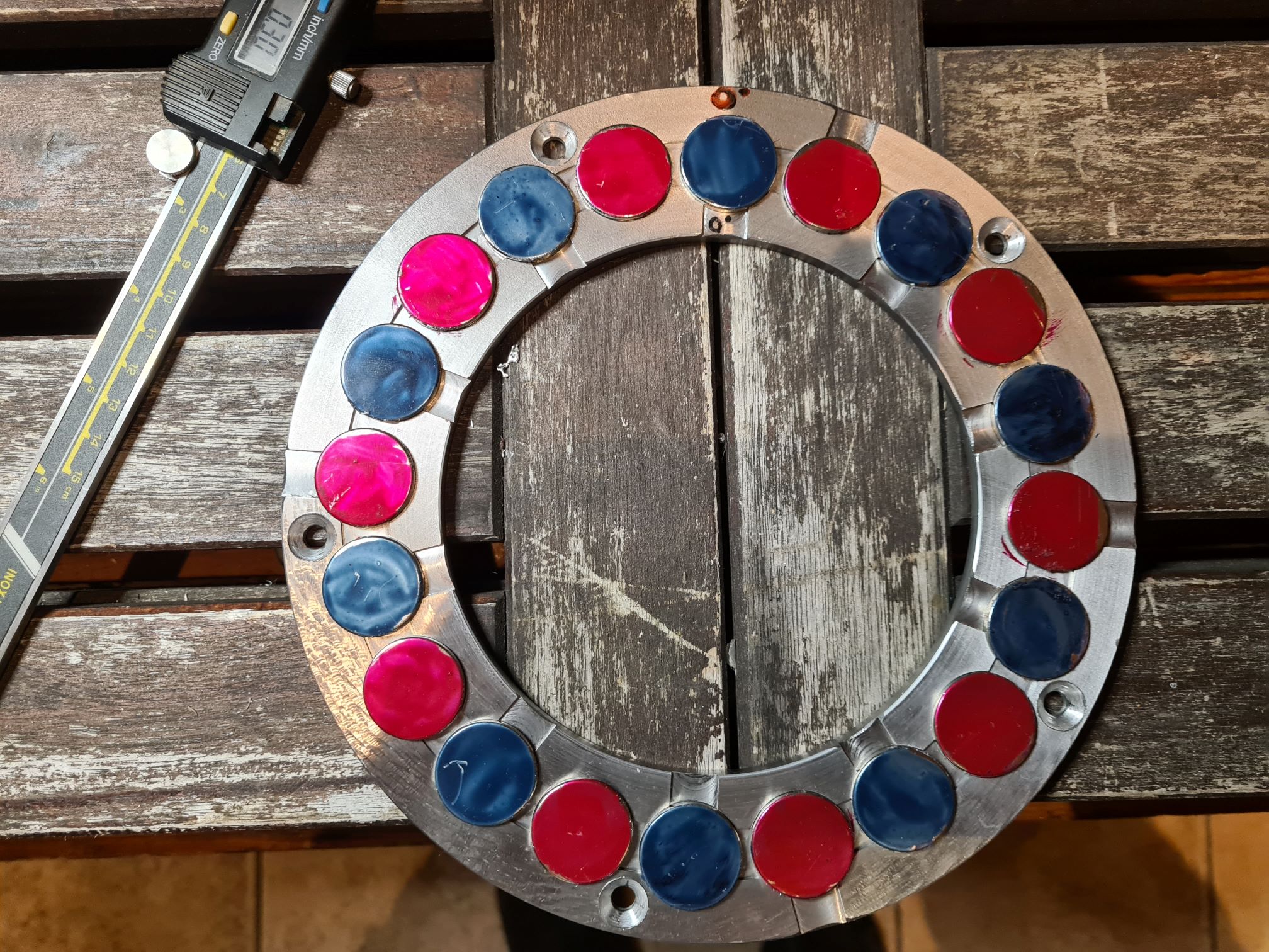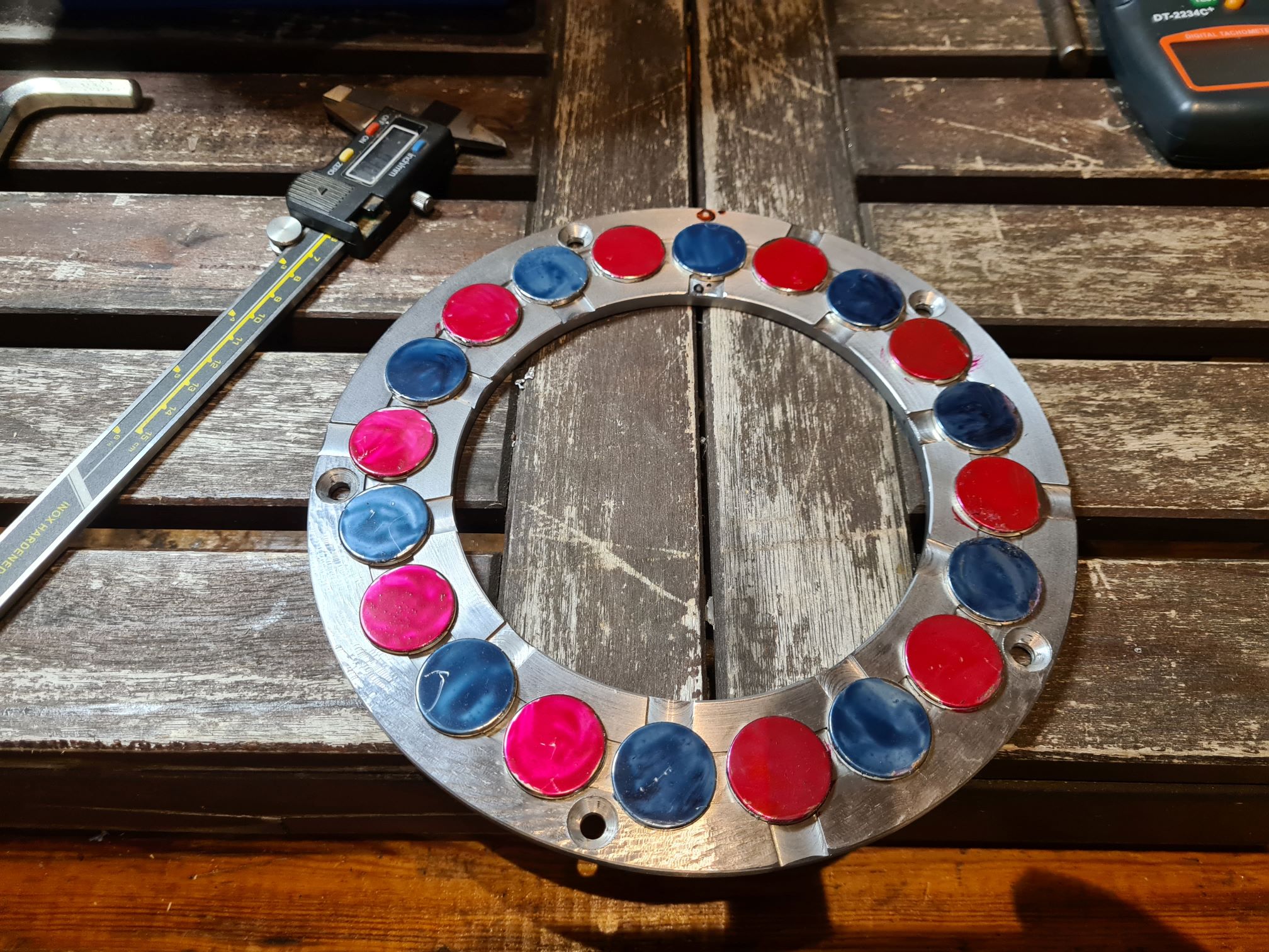 Konstruktiv habe ich es so gelöst, das man (vlt) noch dickere Magneten verbauen könnte. Dazu müssten lediglich die Taschen für die Kurzschlussringe in den Gehäusehälften tiefer ausgedreht werden. Momentan habe ich ca. 8mm Abstand zwischen meinen 25x3mm Magneten. Auch sind diese, momentan, noch nicht auf dem Ring verklebt. Die halten in ihren 1mm tiefen Taschen von allein.