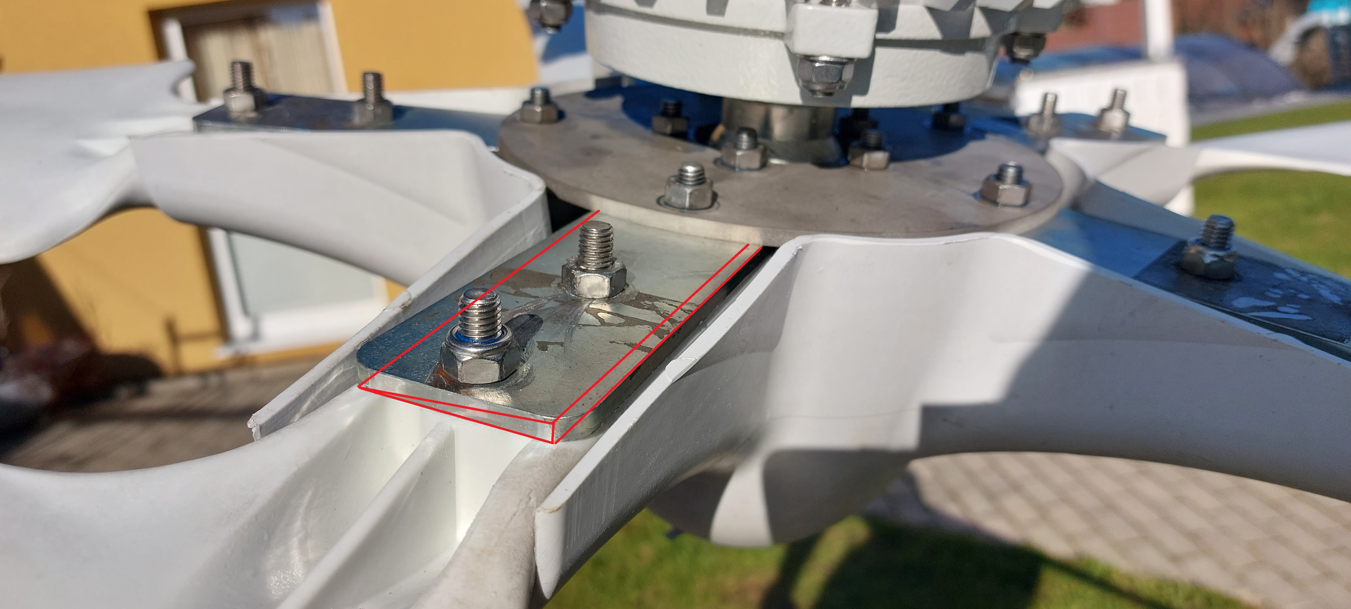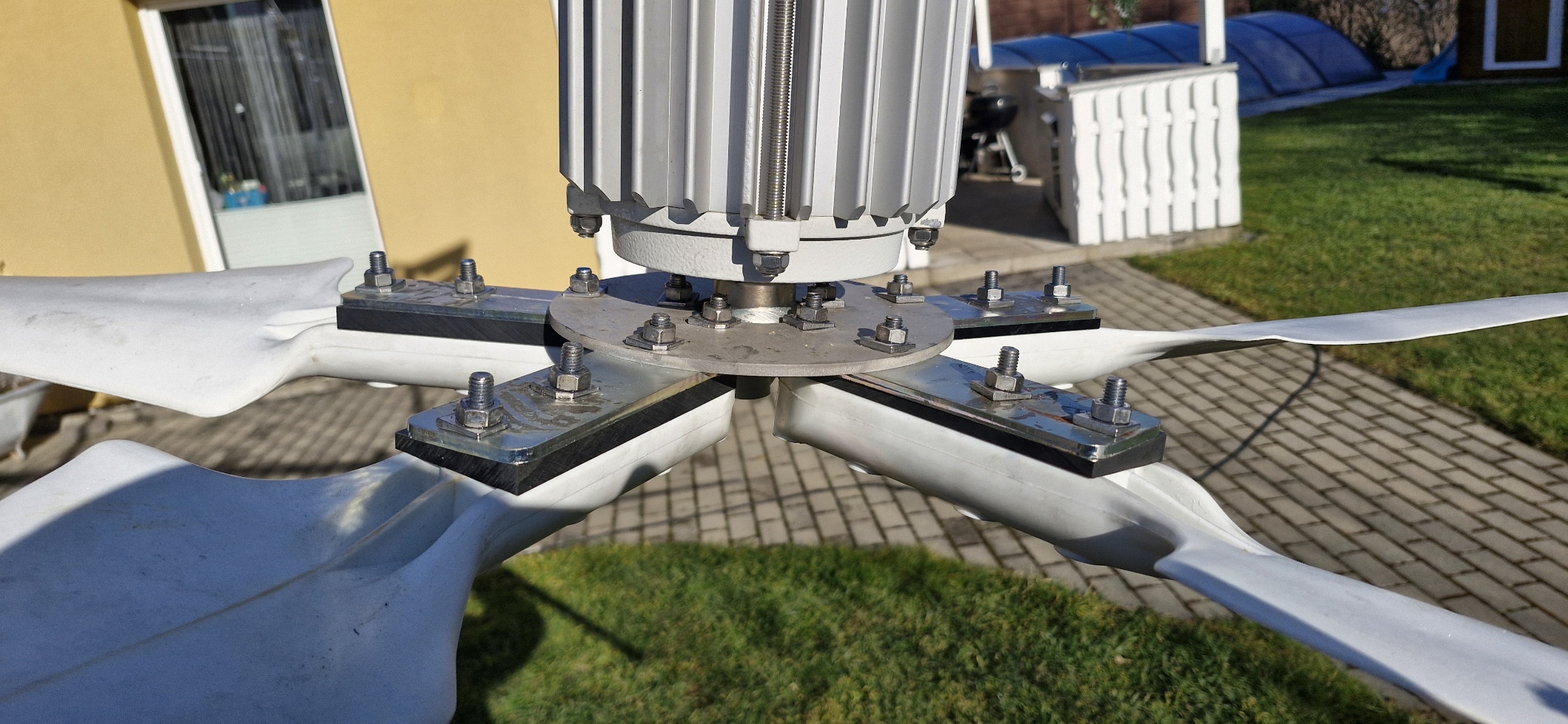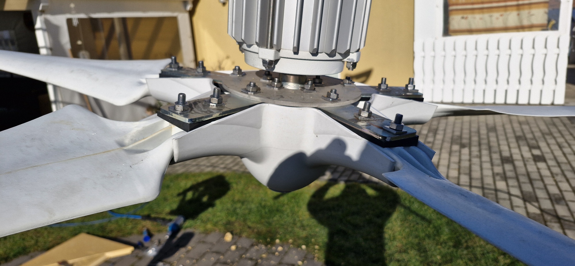 Mein Umbau ist auch vollbracht. Der Mast wieder gehisst. Durch meine 10mm dicke Nabe musste ich die Löcher von 8,5 auf 9,5mm aufbohren, damit die Schrauben 6° schräg durchpassen. Die Keilscheiben aus China sind naja, mal so mal so dick. Ob die alle wirklich 6° haben... Aber sie erfüllen ihren Zweck. Heute war mal paar Sekunden 10kmh Wind. Da ist noch nichts angelaufen. Ich bin so gespannt, was beim nächsten Wind passiert. Laut meinen Videos auf Youtube hatte ich 20W (an/aus) bei 12,4kmh Wind. Da will ich jetzt mehr sehen oder die 20W eher. :-) Kleines Bild vom fertigen Umbau anbei. Danke an Che für den neuen Versuch.