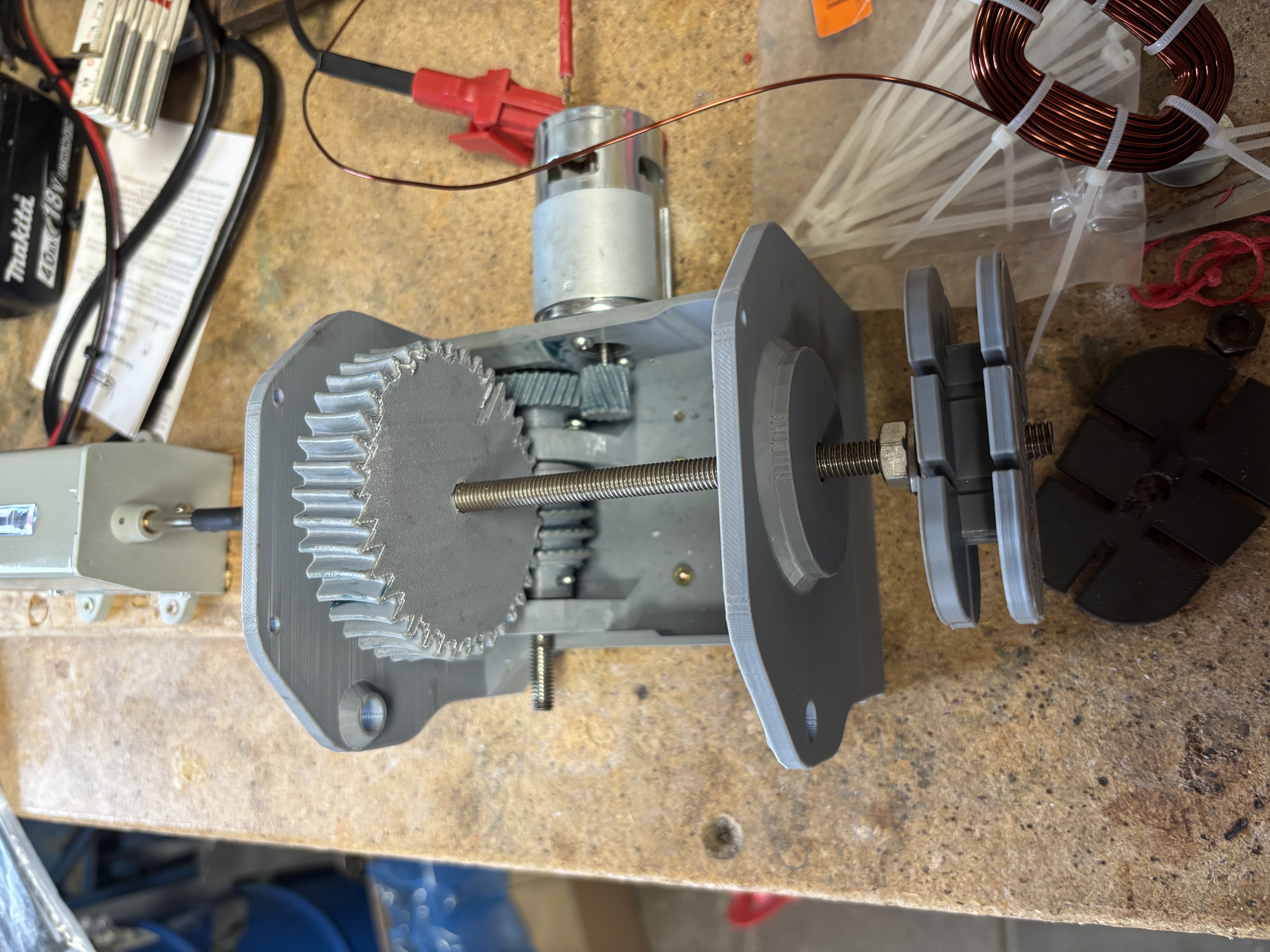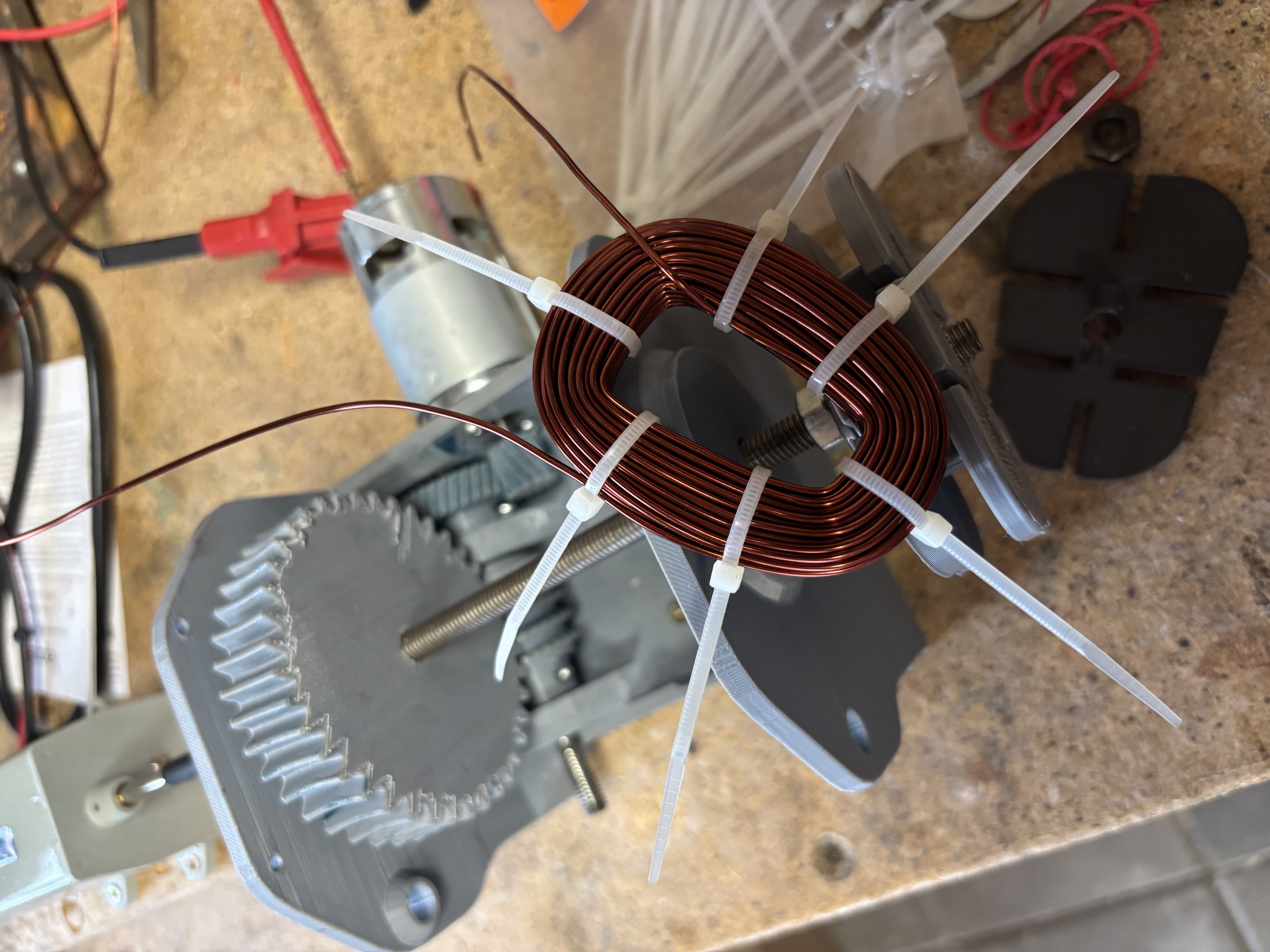 Ich bin’s mal wieder. War die Tage mal wieder etwas am Generator bei. Ich habe mir eine kleine Wickelmaschine zusammengebaut/gedruckt (die Schnecke ist nicht so gelungen, funktioniert aber und ich war zu faul das Raft vom Zahnrad zu fummeln ;-) ) und testweise mal eine Probespule gewickelt. Als Zähler habe ich dann aber doch nix gebastelt. Den analogen/mechanischen gabs für 9€. Die Welle habe ich einfach über Schrumpfschlauch mit der Hauptwelle der Maschine verbunden.