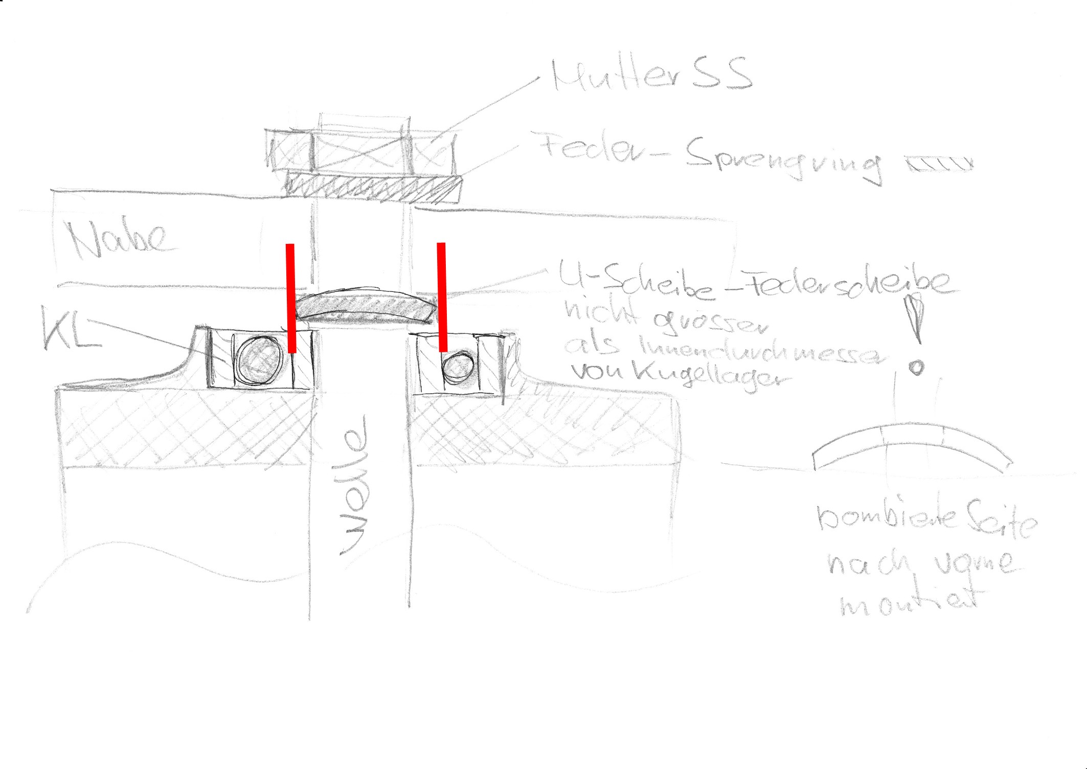 Zuletzt hatte ich Sprengring-Unterlegscheibe-Nabe-Unterlegscheibe-Mutter montiert. Hatte sich wieder gelöst. Die Unterlegscheibe zwischen Mutter und Nabe war pulverisiert und Sprengring und Unterlegscheibe wurden auf das Nichtgewindeteil vor das Kugellager befördert...