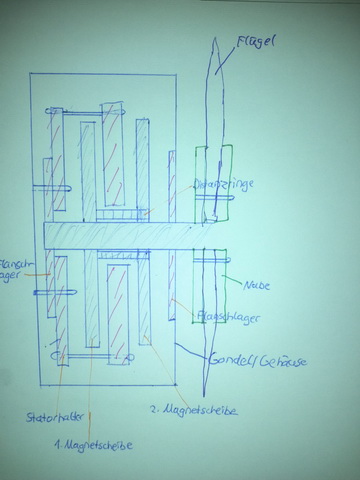 Ich hatte es so gedacht, dass ich die Flügel einklemme zwischen zwei Scheiben. Wie es z.B. bei der Black 300 der Fall ist. Wenn ich die Nabe in die Magnetscheibe integriere, denke ich, müsste diese 10mm dick sein. Dann kommen zu den Löchern, die auf der Magnetscheibe sein müssen noch die für den Rotor. Weil ich aber eine Gondel fest eingeplant hatte, da diese den Generator vor Umwelteinflüssen schützt, ist diese Variante nicht möglich. Deshalb die extra Nabe.