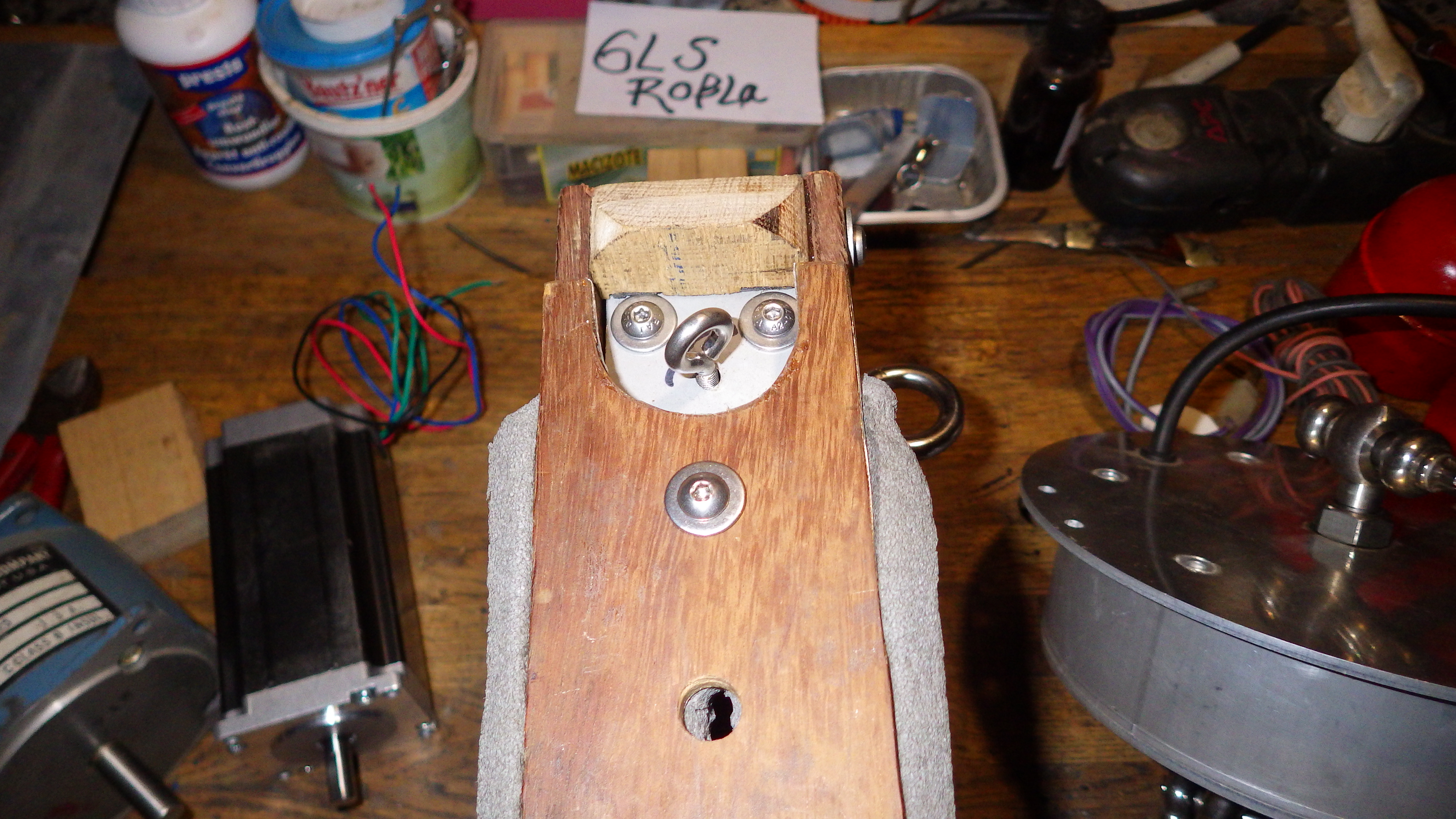 Man sieht auf dem Foto nur die Ringöse die im Kasten den Stepper dreht. Auf der Stepperachse sitzt noch eine auf der Drehbank gemachte Messinghülse im die die Ringschraube für die Rotorkette eingeschraubt wurde. Zwischen Ringschraube und Messinghülse ist noch ein Lagerkäfig mit einem Axiallager welches verhindern soll dass die Rotorkette eines Tages die Achse aus dem Stepper zieht.