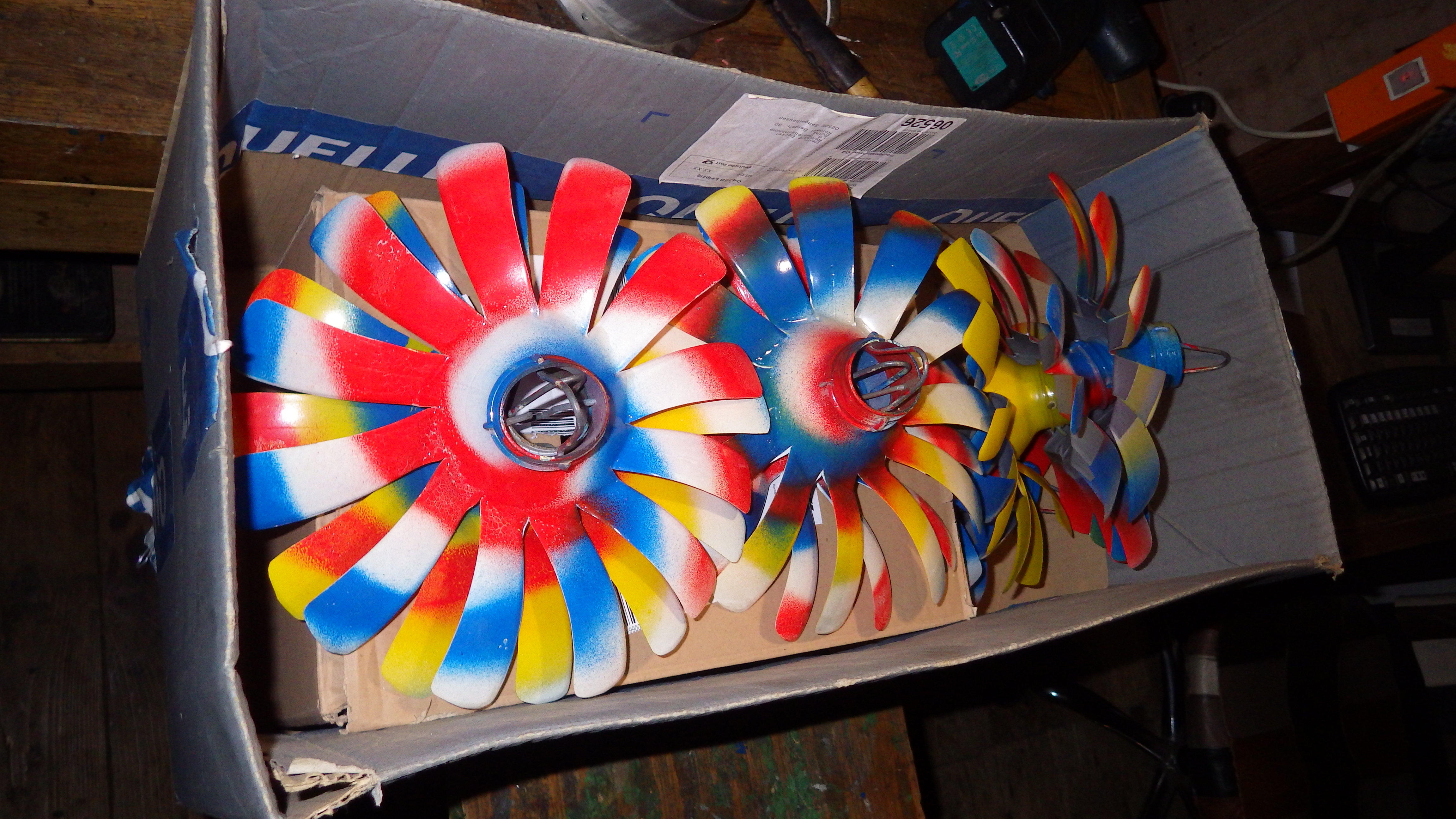 So zwischendurch für ein paar Plastikrotoren die aus 5 L Petflaschen zurechtgeschnippelt wurden meine Lösung für romantische Partybeleuchtung in einer wetterfesten Holzkiste: