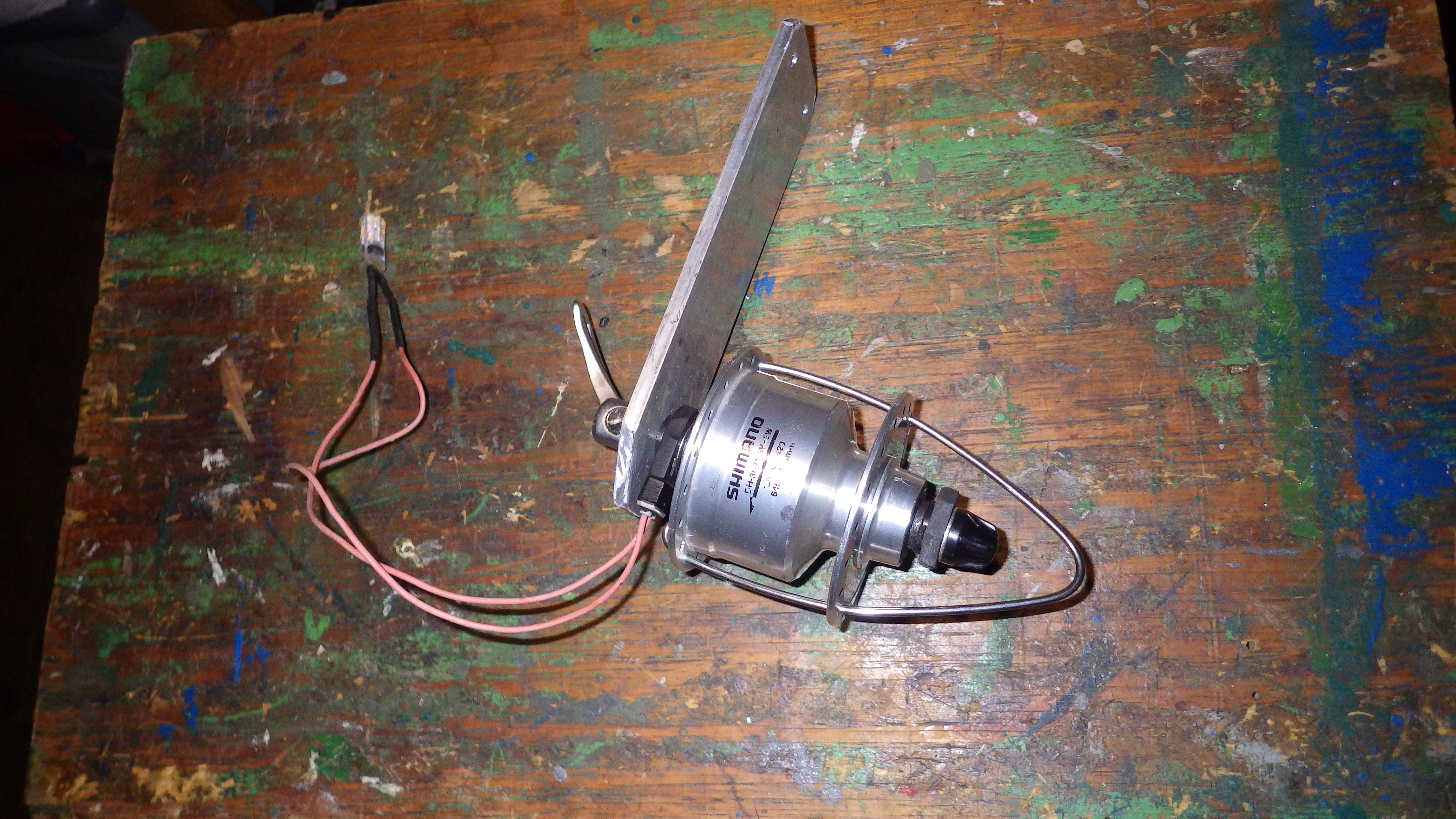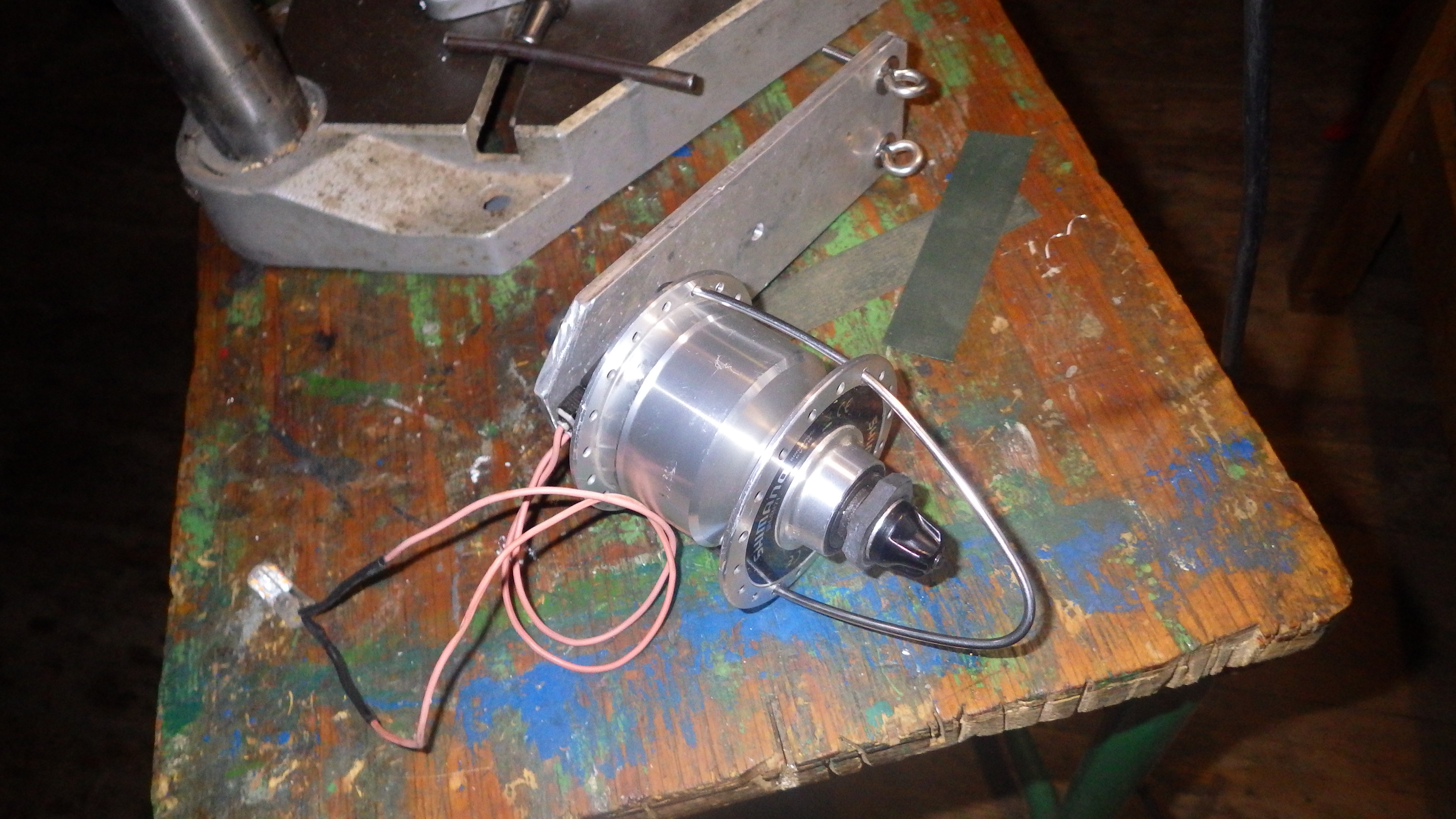 Dann habe ich auch noch einen Fahrradnabendynamo für Kettenrotorbetrieb präpariert. Das erklärt sich von selbst auf dem Foto wie. Es ist ein Shimano DH-3N71, der leichtgängigste aus der oberen Mittelklasse und man braucht ihn nur leise anzutippen und das 1,8 W Ledlicht blendet einen!