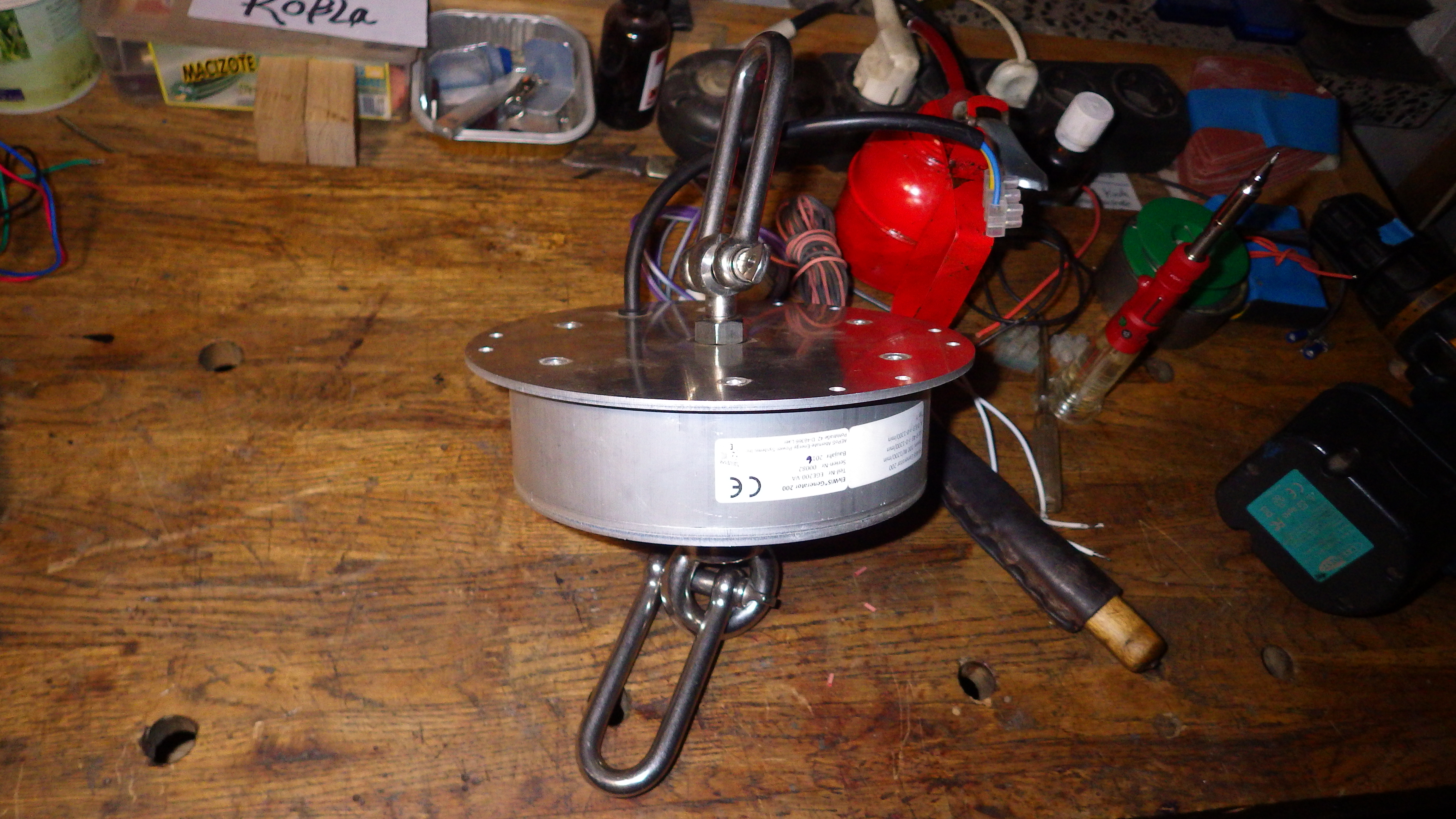 Den gleichen Mini Steppermotor den Illiat in seinem kleinen 50 cm Carbon Windrad verbaut hatte habe ich jetzt in eine Holzkiste zum Aufhängen am Ende der Rotorkette verbaut in die dann noch ein kleiner 12 V 2,1 AH Akku, ein Laderegler mit Batteriewächter und Laststromanschluss, ein Dämmerungssensor und eine Lampe intergriert passen. Daran sollen dann ein paar PET-Flaschen-Rotoren in Kette laufen und genug Strom liefern damit das 1,8 W Ledlicht abends ein paar Std. brennt.