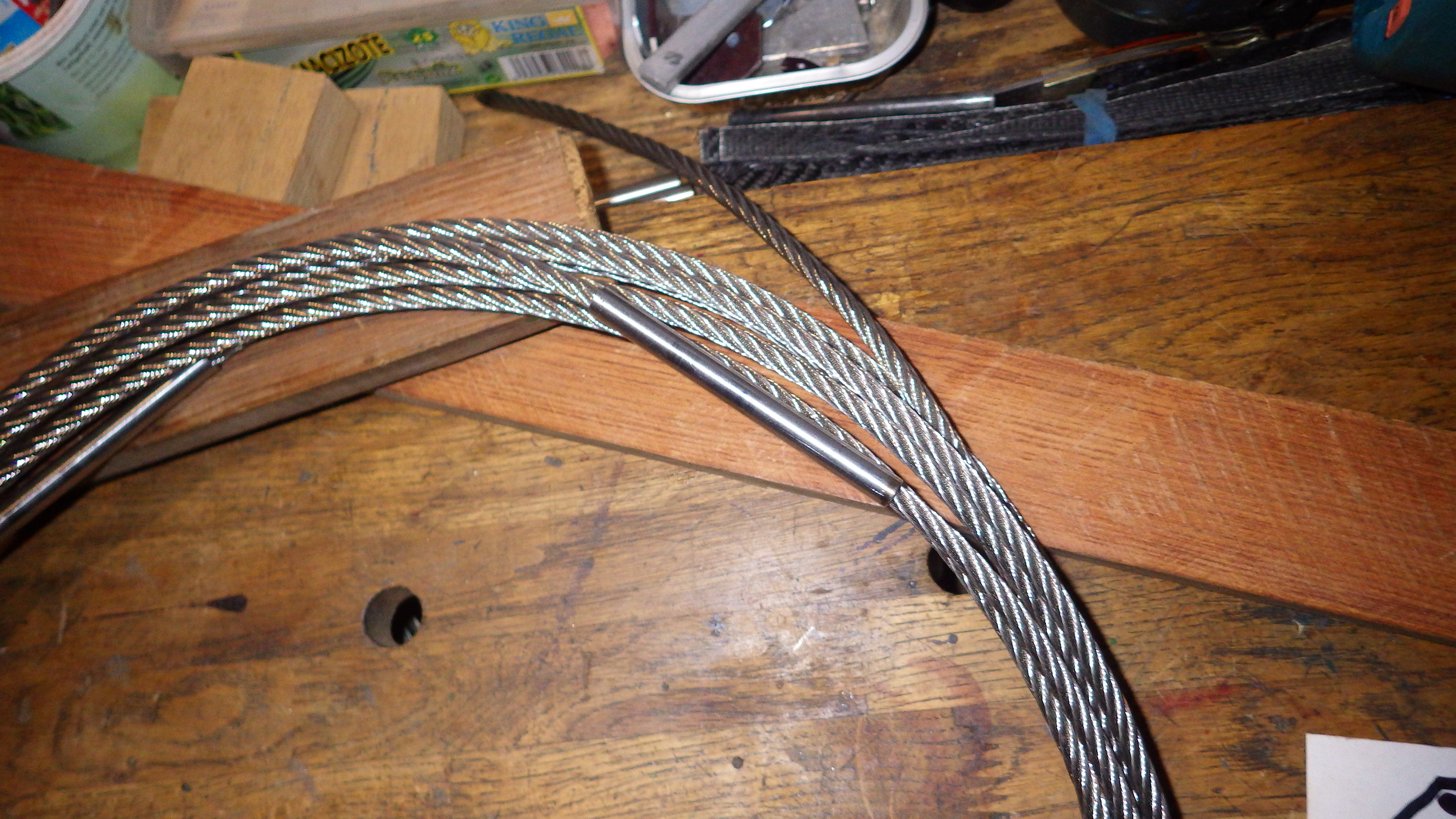 Da ich das Stahlseil schon habe und auch die Rohrstücke die ziemlich stramm auf das Seil passen ist dieser Teil schon fertig. Stundenlange Quälerei.