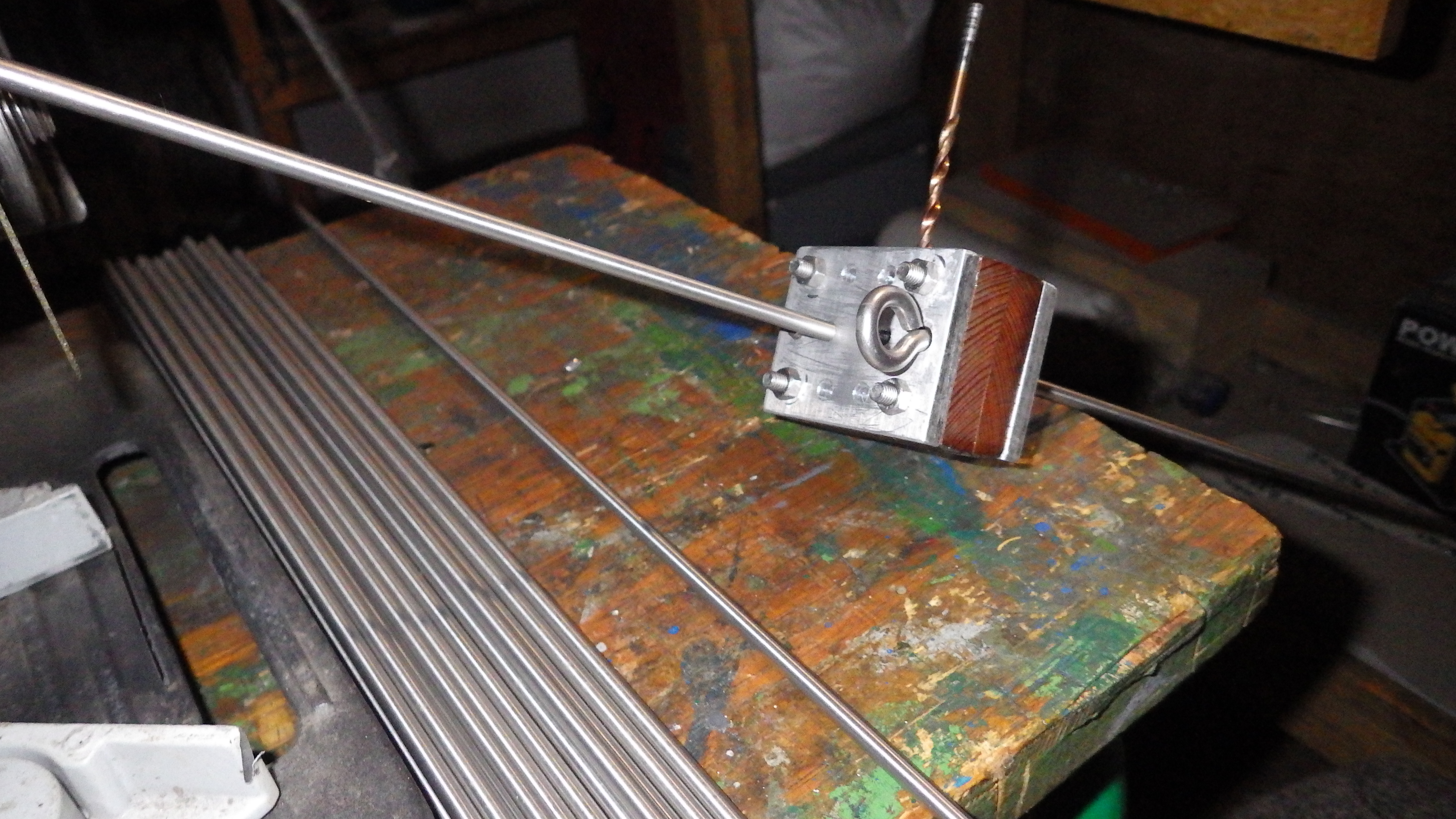Parallel zu den 14 Segelrotoren mit 1 m Durchmesser läuft auch der Prozess mit Kreuznaben für 4 Flügler auf Stahldraht die dann noch grösseren Durchmesser haben können. Hier das Foto von der Kreuznabe auf dem Stahldraht. Die Hülse auf der das Kreuzstück sitzt wird mit JB Weld fest mit dem Stahldraht fixiert, das Kreuzstück wird mit Punktschweißung mit der Hülse festgemacht. Für die Segelbäume kommt dann 13 mm Carbonrohr in VA Stahlrohrhülse, die im Kreuzstück für Versteifung sorgen in Betracht.