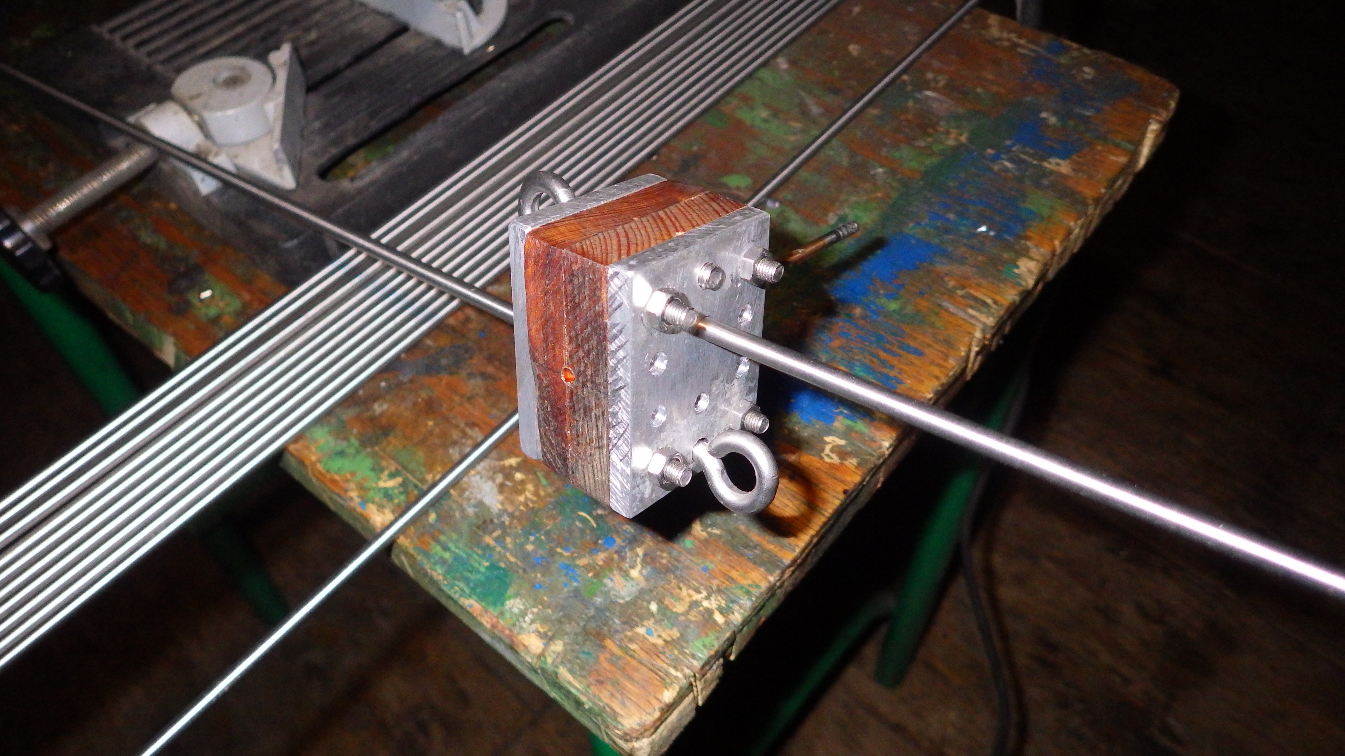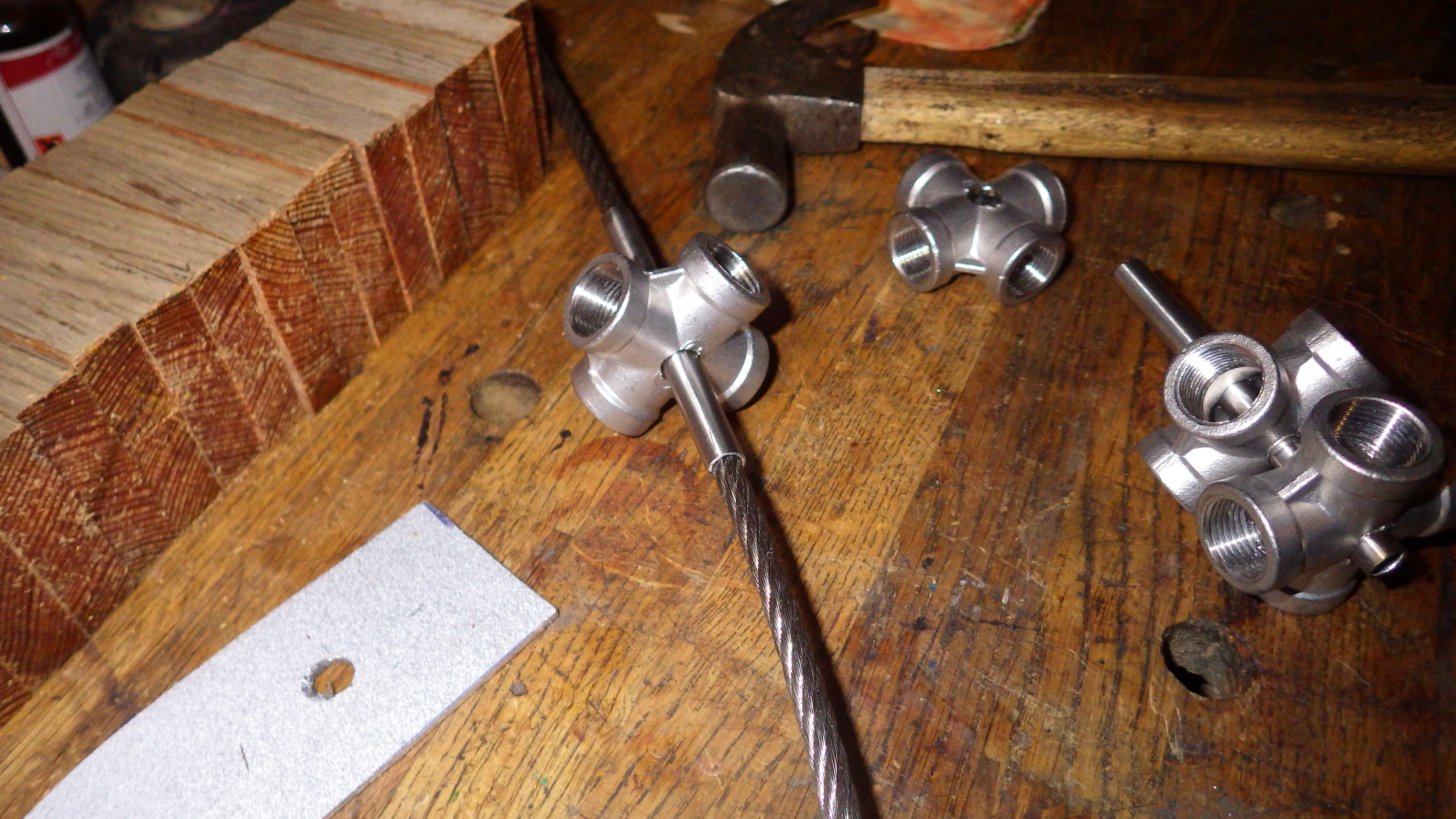 Die Kreuzstücke werden mittig im 90° Winkel zu den Flügeln durchbohrt wie eine Nabe die auf eine Achse gesteckt wird und ein dort eingeführtes Rohrstück wird die Nabe auf dem Stahlseil stabilisieren so dass hinterher nichts beugt oder wackelt.