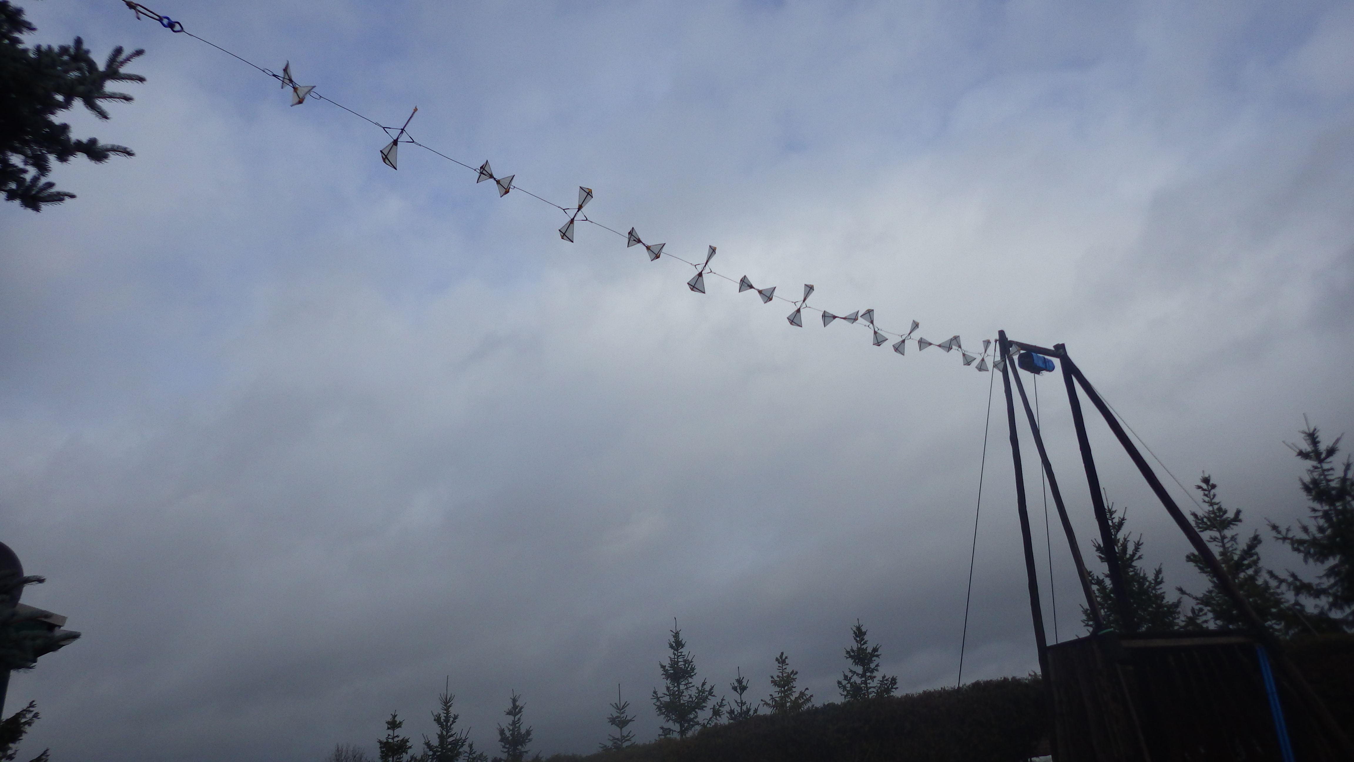 Obwohl alle 36 cm - D Segelrotoren auf der Kette als Zweiflügler laufen kann ich auch in Boen bis 4 m/sec kein spürbares hin & her Geschlacker der Linie sehen. Mag sein - das Versetzen der hintereinander stehenden Zweiflügler um jeweils 90° trägt so zum ruhigen Lauf bei.