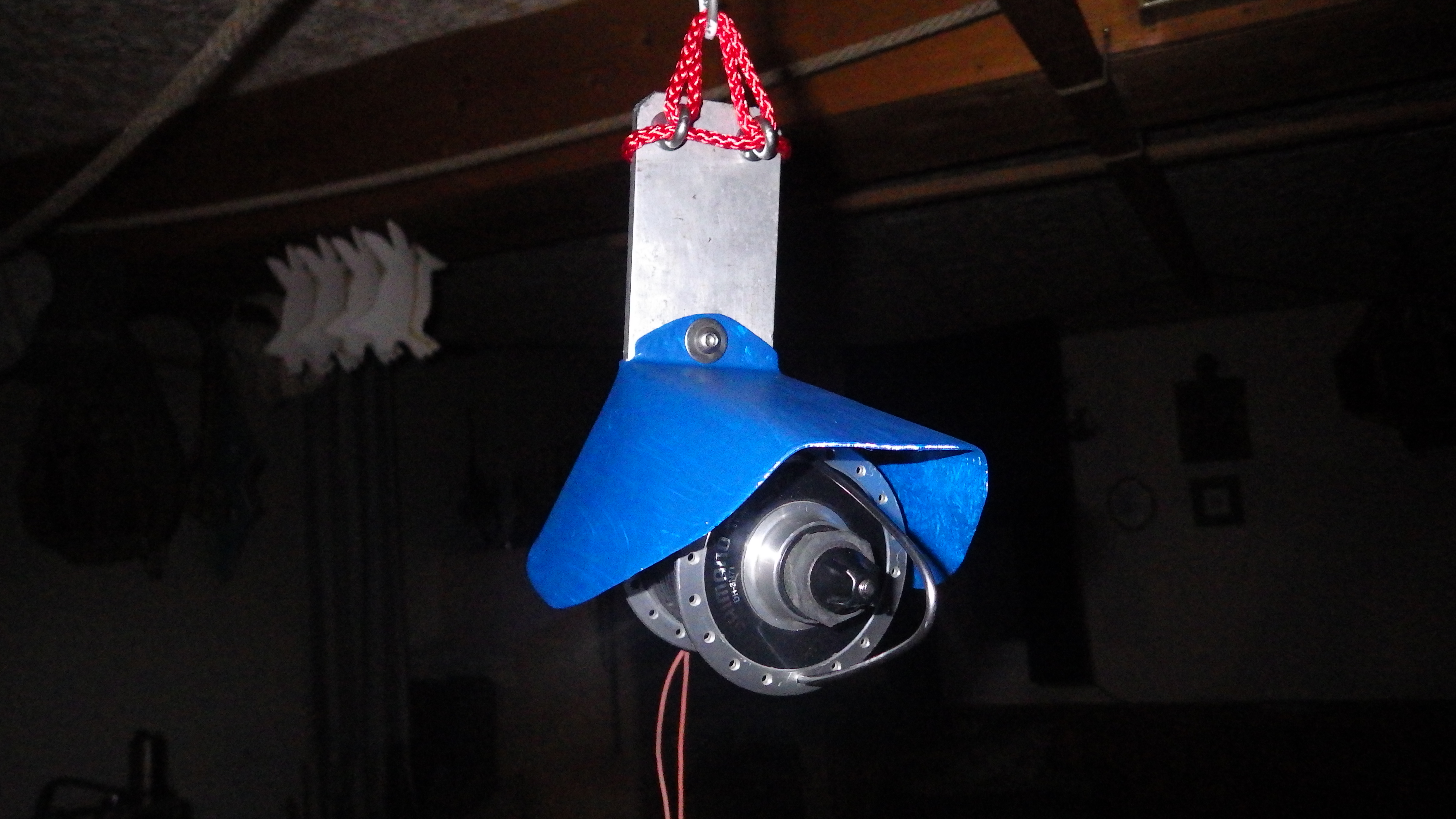 gENAUSO wie der Nabendynamo auf dem Foto an einem Strick hängt wird er auch mit der Rotorkette in die Höhe gezogen. Da wird nichts irgendwo fest verschraubt, in Hängelage ist die Achse des Dynamos nicht ganz Waagerecht sondern so wie die Rotorkette die in einer sanften Katheode verläuft am Anbringungspunkt linear zu dieser.