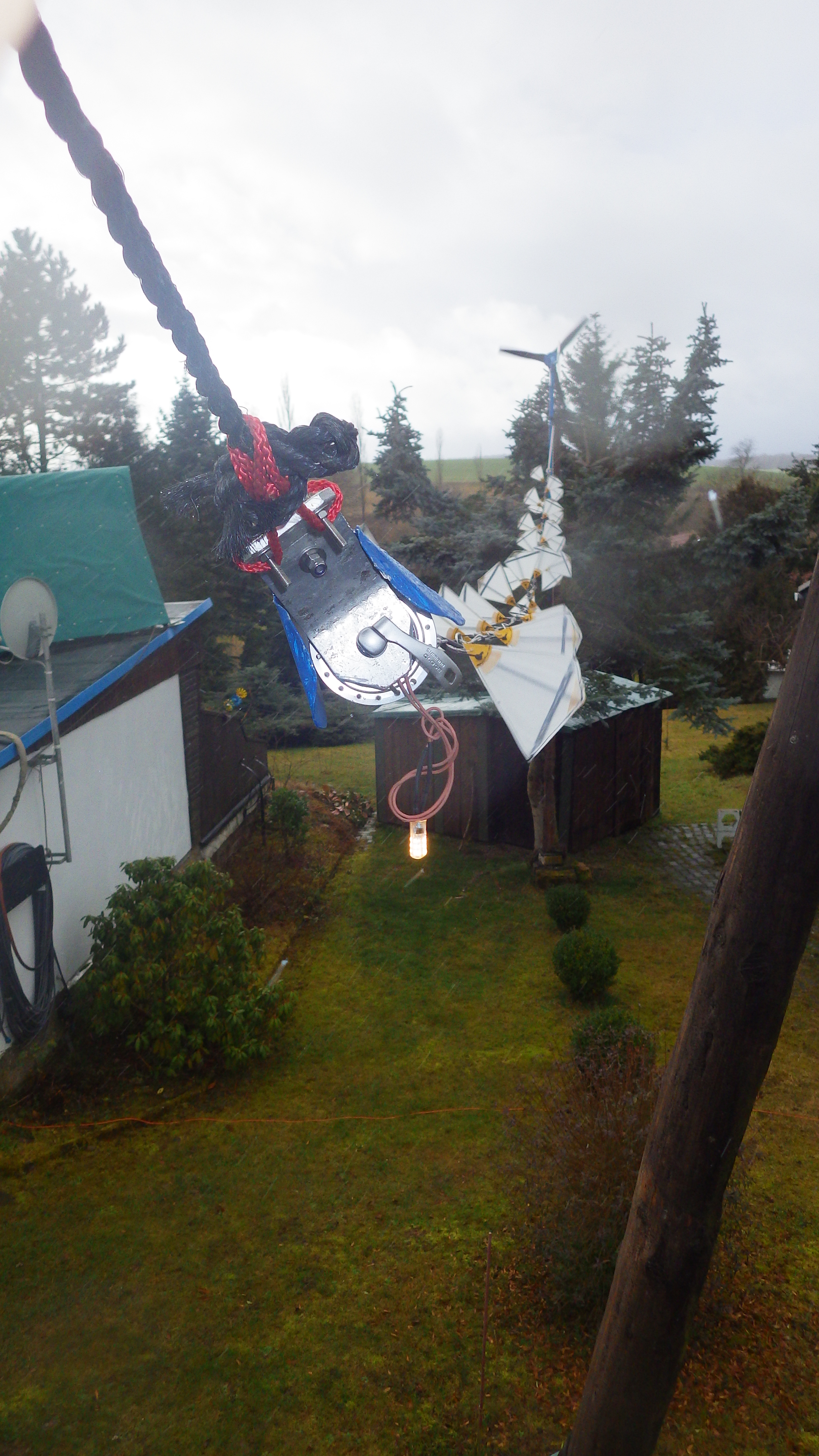 Die Kette dreht am besten wenn Wind frontal drauf bläst mit kleinen Toleranzen, das kleine 12 V LED mit 1,8 W direkt am Waschmaschinenmotor angeschlossen leuchtet erst in den seltenen Windstößen bei 4 m/sec hell auf.