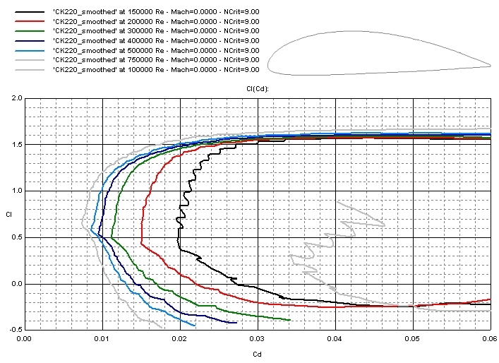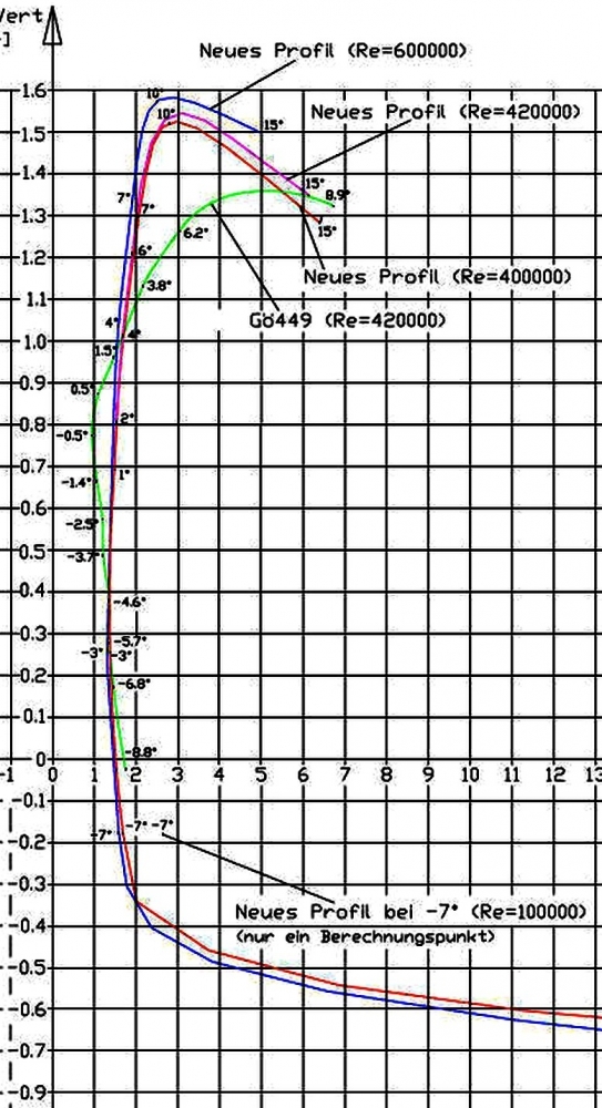 Habe aber gelesen, das dieses Profil schon bei einer Re Zahl von 150.000 "gute Werte" bringt. Das wäre bei ca 2 m/s an den Flügelspitzen bei einem 4m Rotor mit 3 Flügeln bei einer SLZ von 5!