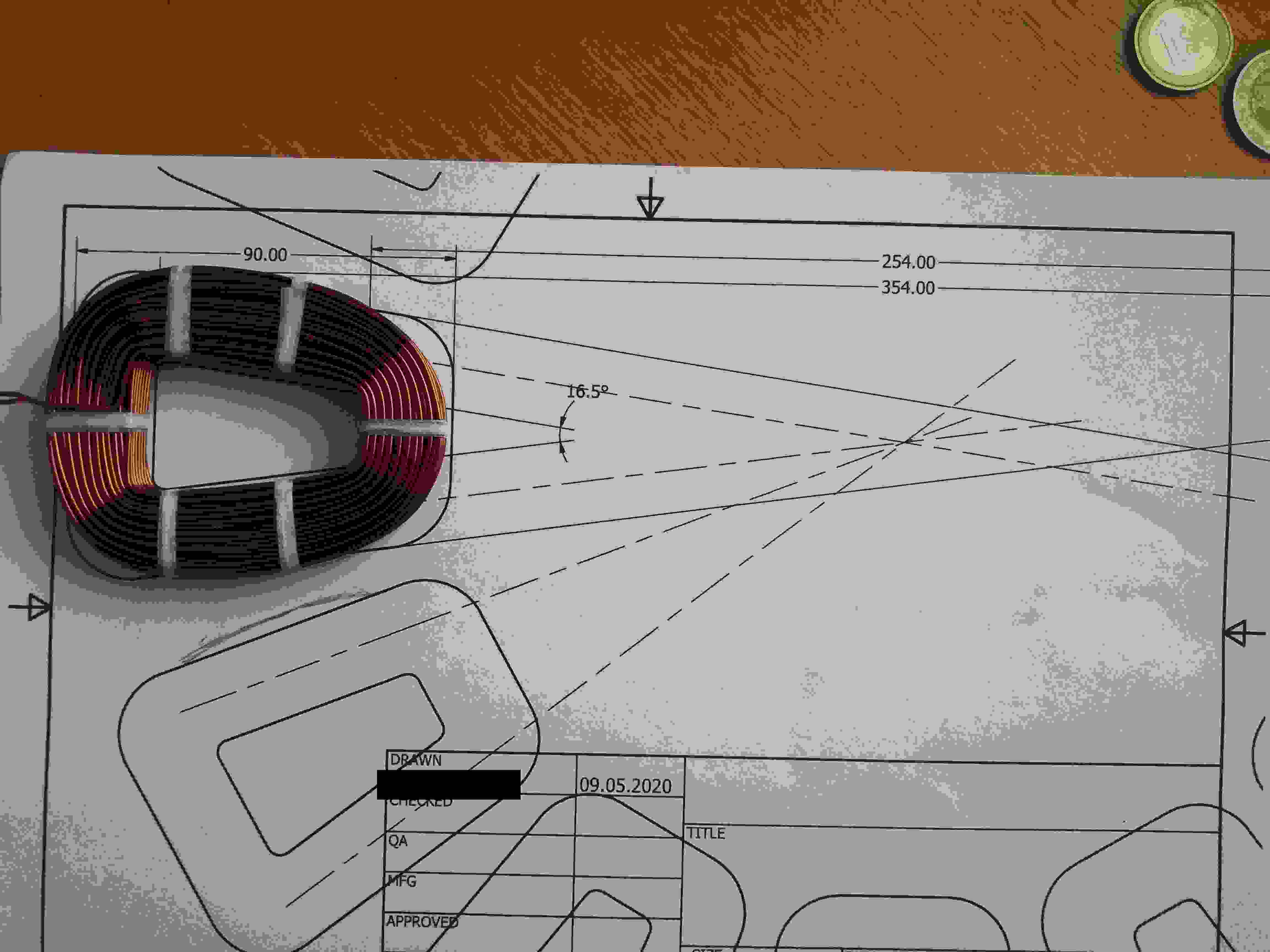 Das Spulenschema, zumindest zwei ganze Spulen habe ich auf ein A4-Blatt gebracht, ausgedruckt und dann meine Testspule auf darauf gelegt.