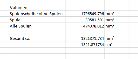 Dazu hab ich mir die Volumen der Spulenscheibe ohne Spulen errechnet und das Volumen aller Spulen.