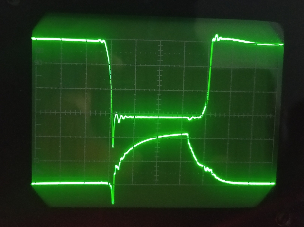 Unten mal noch die Gate-Spannung vom Lo-FET T4. Passt schön in die Lücke, aber recht wilde Schwingungen.