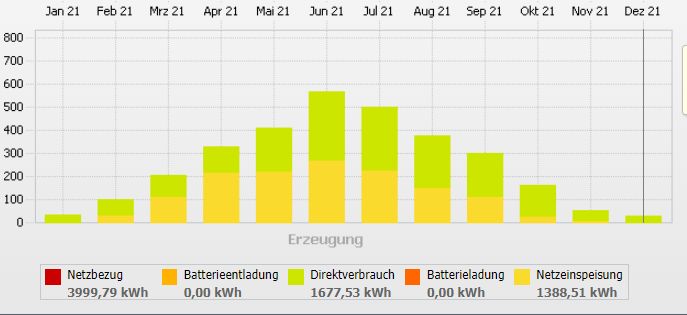 Meine kleine Anlage mit 3,6 kWp bringt im Winter durchschnittlich 30 bis 40 kWh pro Monat (also 0,3 bis 0,4 kWh/Tag und kW) , im Sommer hingegen 400 bis 600 kWh pro Monat (4 bis 6 kWh/Tag und kW), also das 13 bis 15 fache.