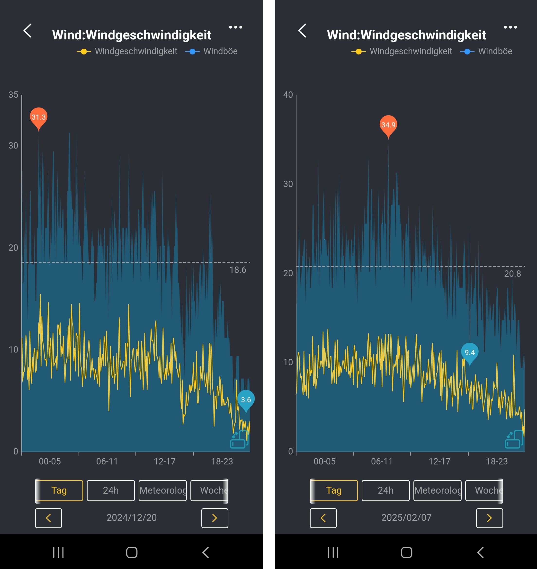 Ich habe mal versucht grafisch abzubilden, was der steilere Anstellwinkel bewirkt hat. Anbei zwei Bilder. Ich habe zwei Tage raus gesucht, mit annähernd gleichem Wind laut meiner Wetterstation knapp unterm Windrad. Ich sehe da mehr als eine Ertragsverdoppelung! Leider habe ich bei mir in der Stadt ja nicht so oft Wind. Meistens geht überhaupt erst was, wenn bei Wetteronline schwarze Fahne steht. Der Sattelitenfilm für Wind musste bisher schon gut gelb sein um nur wenige hunderte Wattstunden zu ernten. Bis vorgestern! Der Windradar war noch grün, mäßiger Wind bis 20kmh stand darin für meinen Standort. Das Ergebnis ist für mich beeindruckend, seht selbst. Achtung im Leistungsdiagramm die Achse hat einen anderen Maßstab alt 24W max und neu 60W!