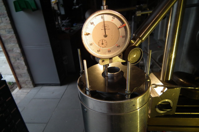 2: magnetträgerplatte wird eingemessen. sie sollte, wenn möglich vollkommen plan laufen. 5/100 mm abweichung geht noch. hier 3/100. offensichtlich ist die platte super gerade.