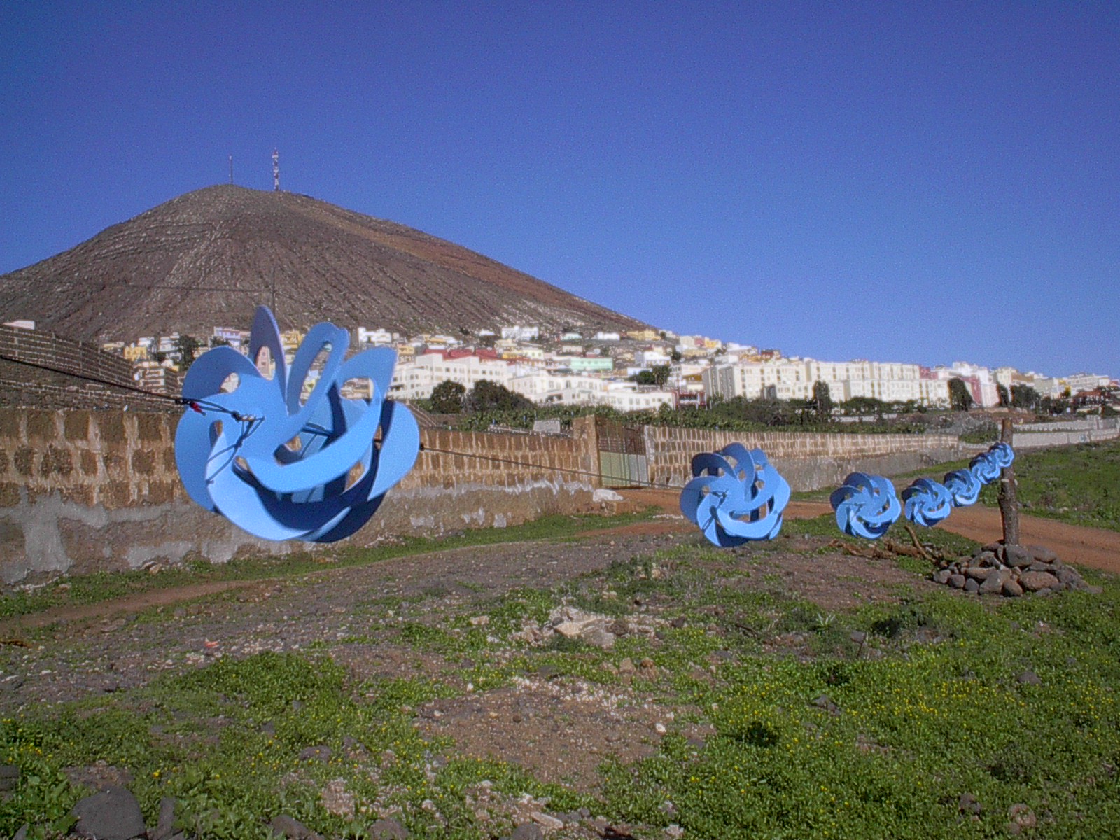 ich hatte doch das kleine Kettenwindrad wieder runtergenommen um Vorflügel a la C-Rotor davorzunähen. Damit fast fertig hatte ich die fertigen nacheinander aufgehängt, immer 1 oder 2 am Tag dazu. Jetzt sind es 11 kleine Segelrotoren die hintereinander laufen und da ich besorgt war das sich mit der Zeit die Edelstahldrahtösen mit denen sie ineinandergehängt werden durchscheuern habe ich öse an öse immer mit ein paar windungen Takelgarn miteinander verbunden, Normal hängen die Rotoren über Kreuz so das das vordere nicht im Windschatten des folgenden steht. Durch die Befestigung mit Bändsel untereinander gibt das ein bisschen Spielraum für torsion und die Segel machen nun genau das was vorher schon von der ablaufenden Strömung in Spiralform gesagt wurde. Das Kettenwindrad mit den 2 Flügler Segelrotoren nimmt beim Laufen eine gleichmäßig geformte Spiralform an! Ich bin begeistert!
