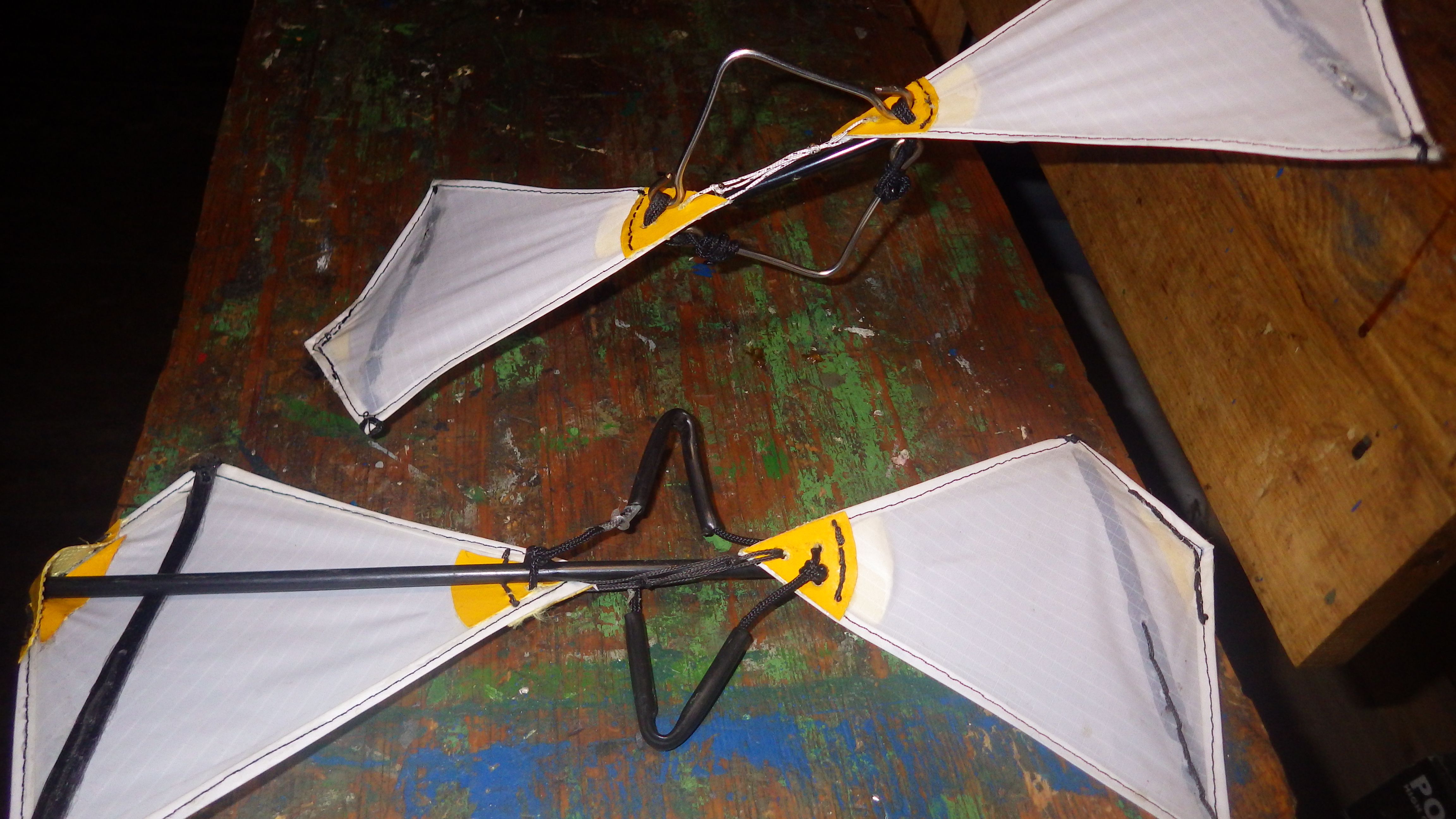Im Sturm zeigt sich gerne der Teufel der im Detail steckt. Die 15 Segelrotoren die mit plastikarmiertem Takelgarn in die Ösen der VA Drahtstücke eingehängt waren hatten noch zu viel Spiel für Torsion. Das mache ich jetzt anders so dass die Kraftübertragung gleichmässiger wird.