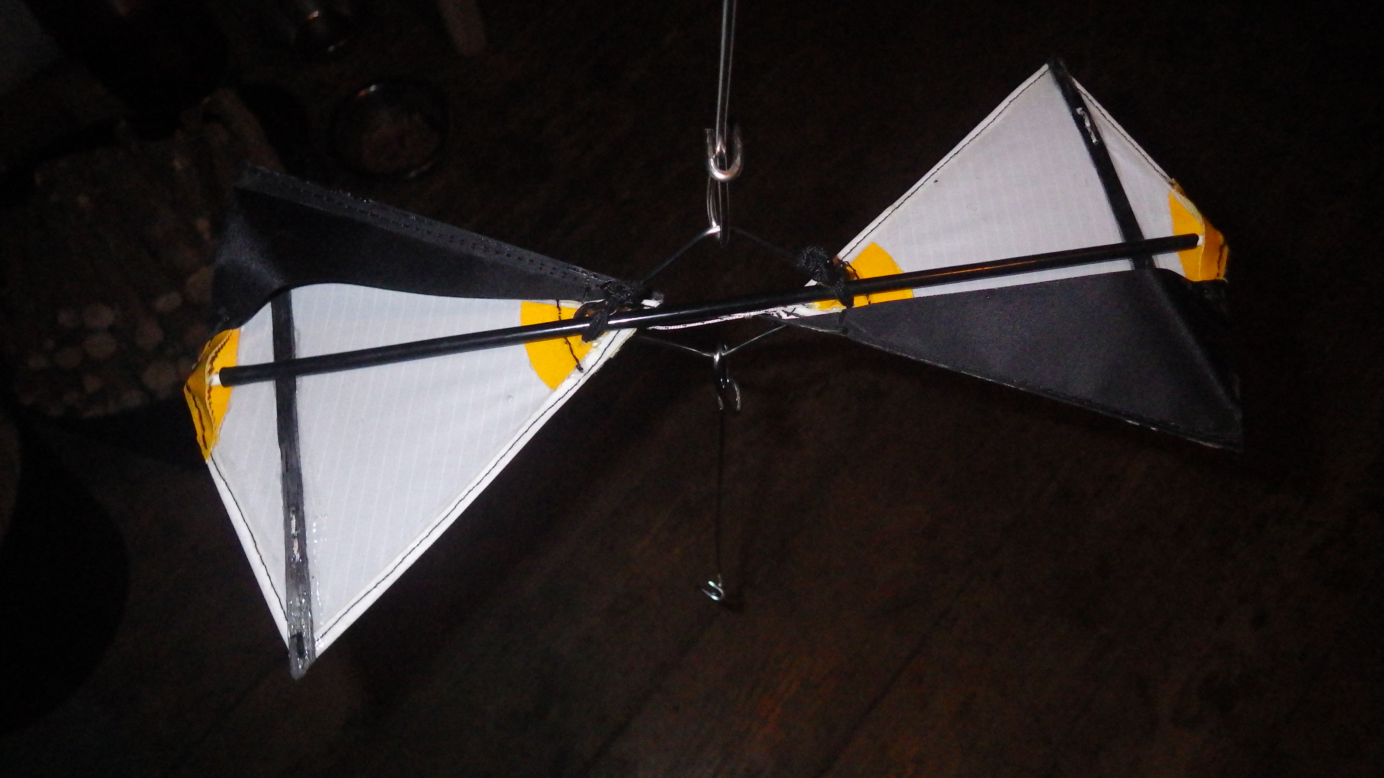 Das nächste Modell läuft denn auch auf einen torsionsfeserem Stahlseil, auch der Vorschlag mit mehr als 2 Flügeln ist aufgegriffen. Es werden 4 Flügler wo die Carbonstäbe leicht demontabel in mit Hülsen verlängerten 1/8" VA Kreuzstücken sitzen die mittig durchbohrt auf ein an den entsprechenden Stellen mit einer VA Hülse bewehrtem Stahlseil eingefädelt und auf der Hülse mit Punktschweißen fixiert sein werden.