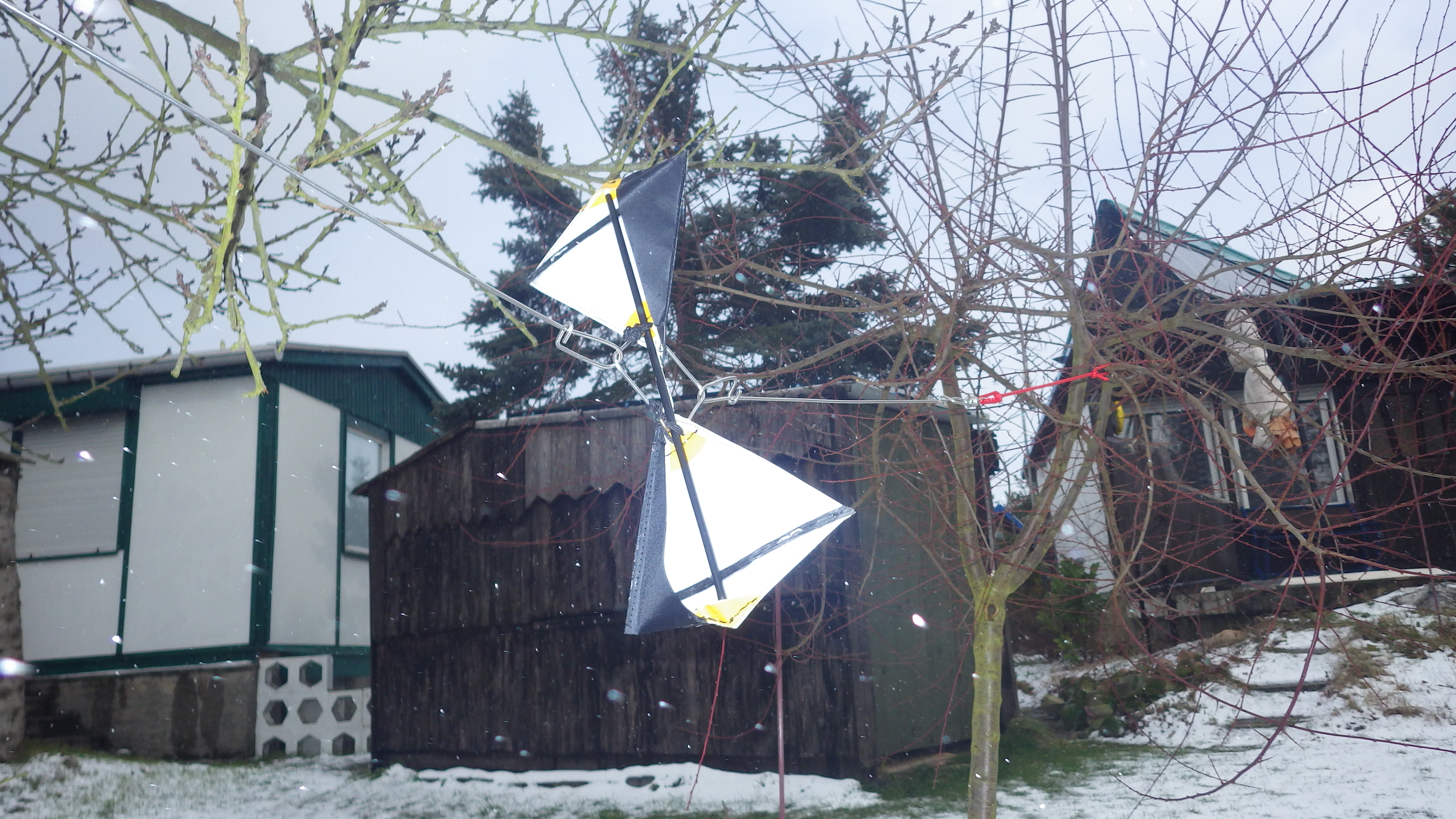 Das Ergebnis war wie bei C-Profilen zu erwarten, der C- Segelrotor hat trotz ständigem Wechsels aus der Hauptwindrichtung gut gedreht mit etwa 120 RPM bei 3 m/sec Wind - was an vorbeifliegenden Schneeflocken und ohne Uhr "gemessen" wurde !