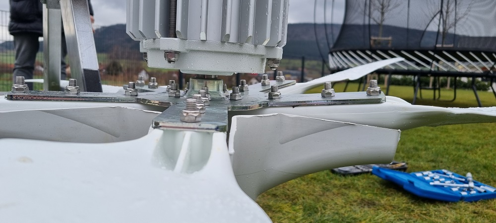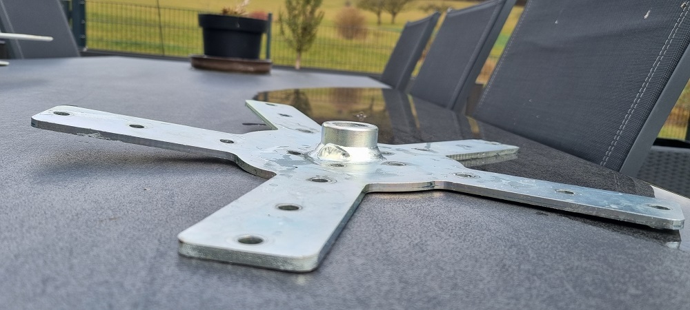 Also habe ich heute den Mast umgelegt - in der Tat, die Bohrungen im Holz waren etwas ausgeschlagen, die Ista hat leicht gewackelt - aber schien mir nicht gravierend. Nun gut, wenn da ordentlich Wind bläst, kann es schon stärker wackeln. Also schnell eine neue Halterung aus Metal geschweißt, montiert - und vor dem Aufstellen des Mastes nochmal kurz die Rotorblätter checken wollen - und siehe da: