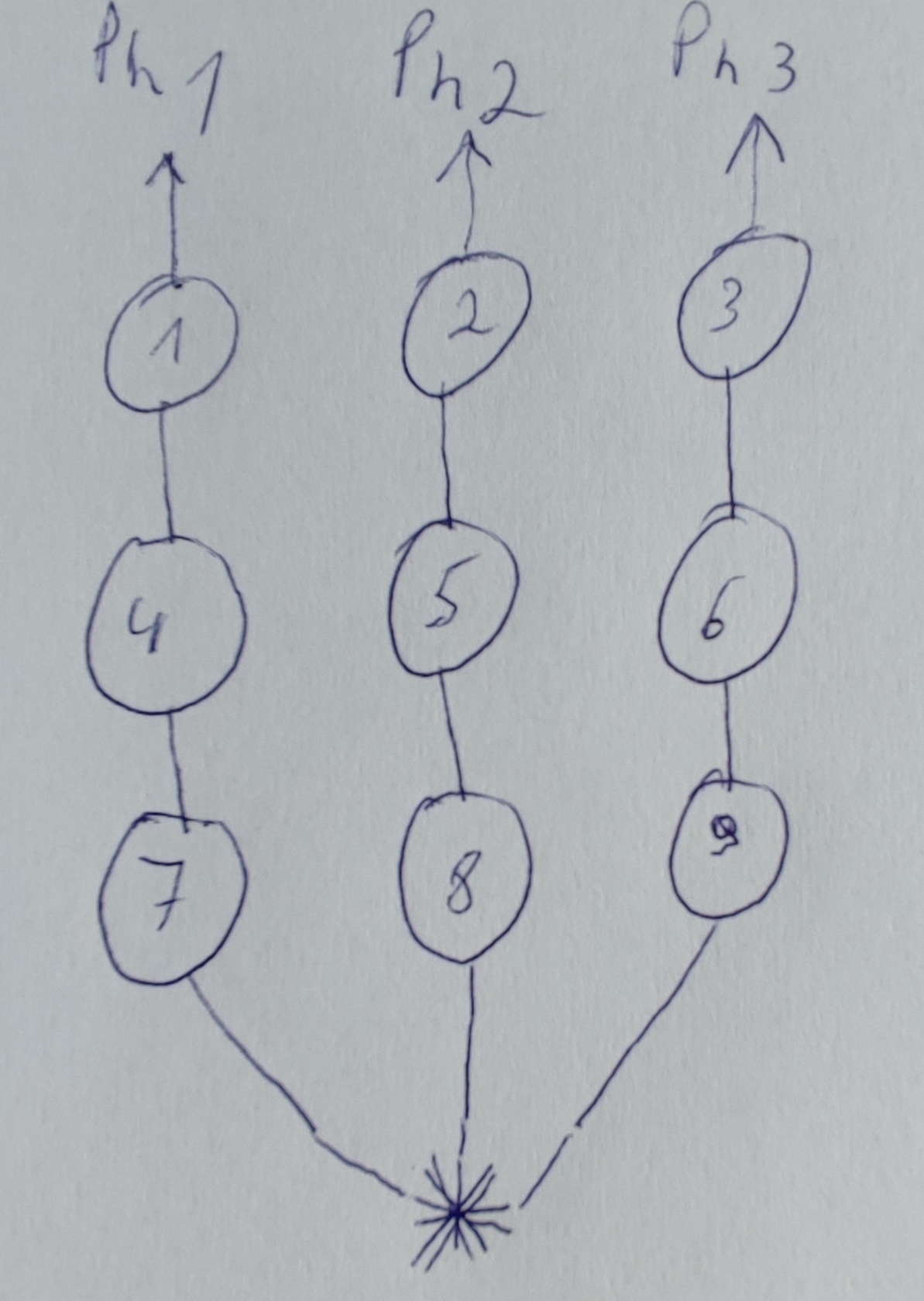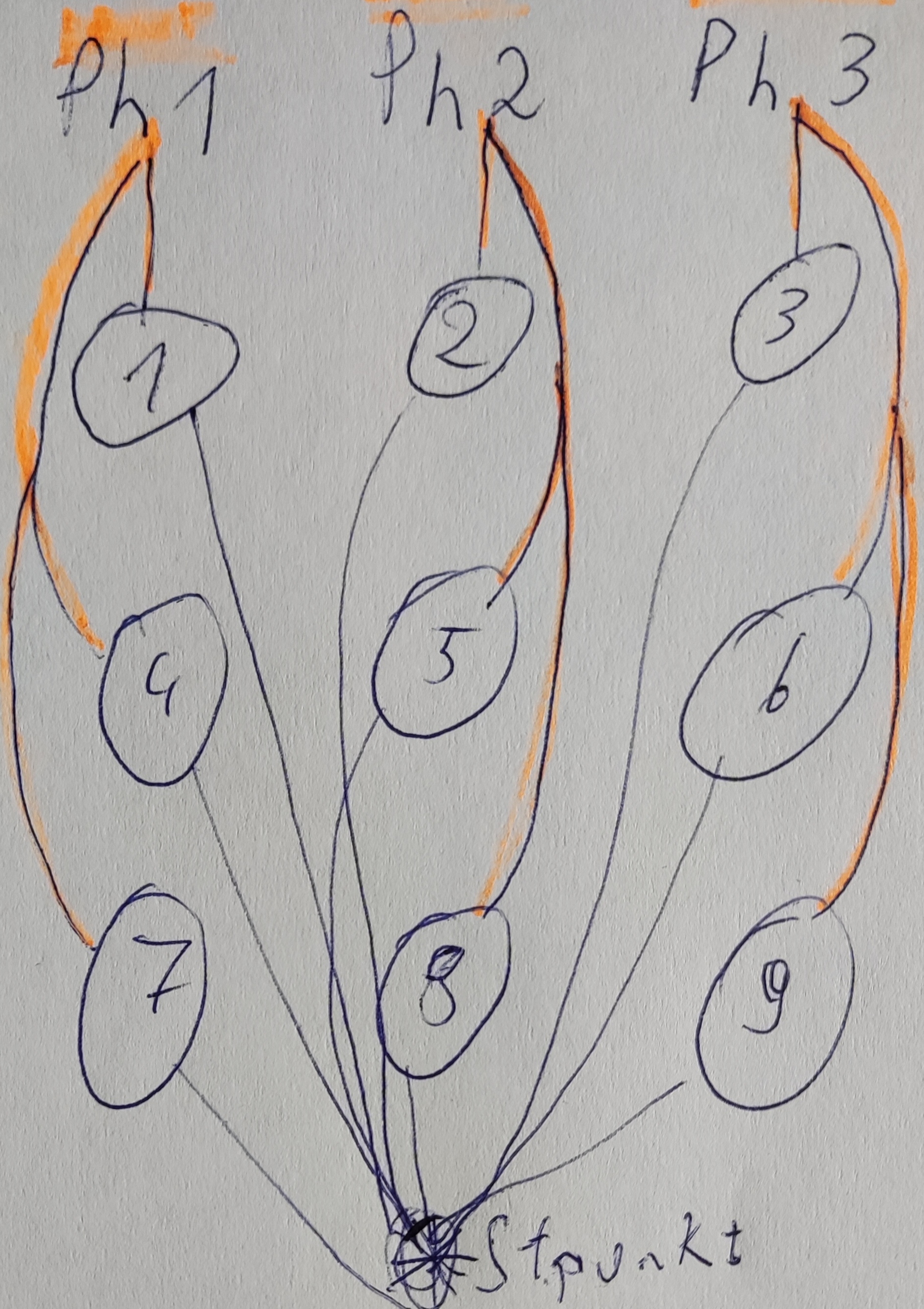 Das Ende (Äußeres Drahtende) von 1,4 und 7 zu Phase 1 zusammen, 2,5,8 zu Phase 2 und 3,6,9 zu Phase 3.