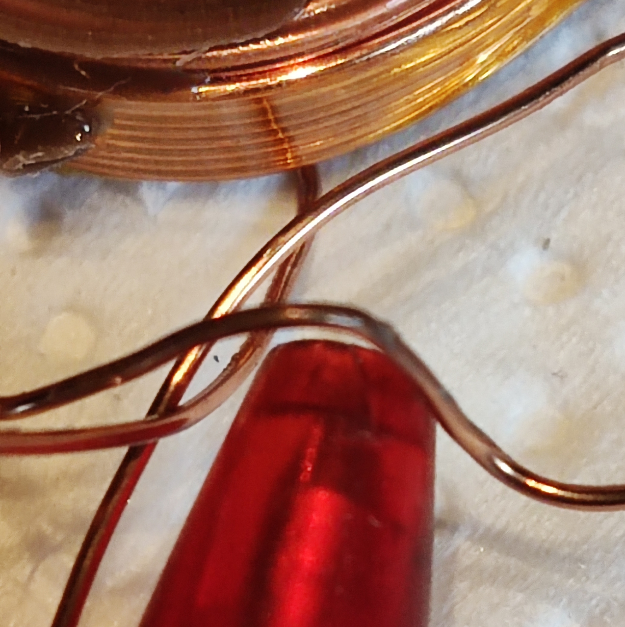 Hier eine Stelle (vor dem roten Stift) wo ich Durchgang habe, also das Voltmeter piept, bei Durchgangsprüfung, weil die Isolierung ab ist.