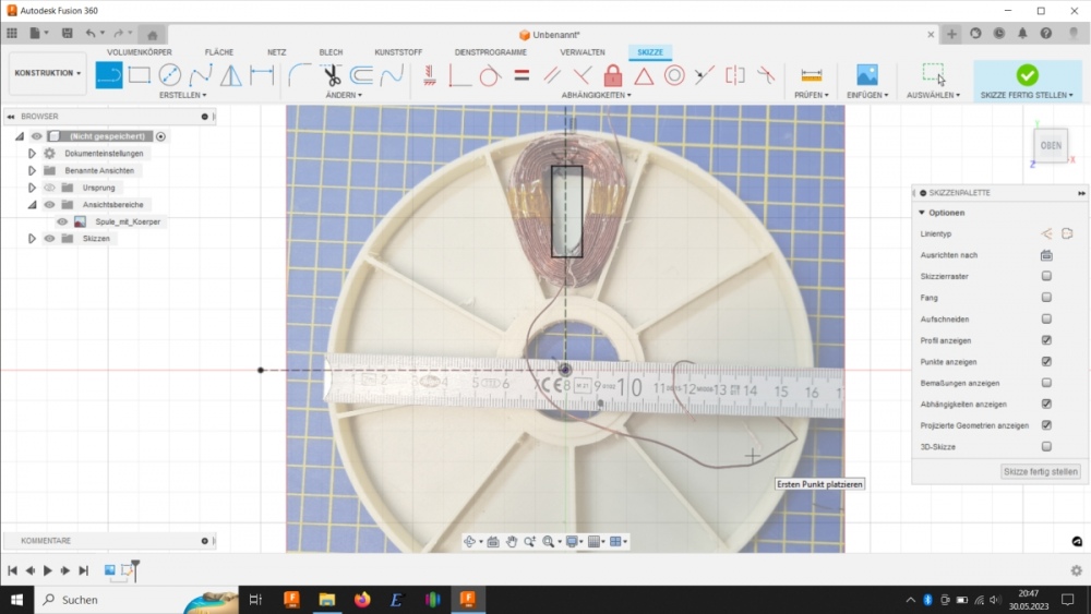 So würde das jetzt ausschauen nachdem ich die Spule nochmal geändert habe, Das Rechteck das ich rein gezeichnet habe wäre jetzt ein Magnet 10x30. Spule hätte jetzt 200Wd. mit 06er Draht, mehr geht nicht