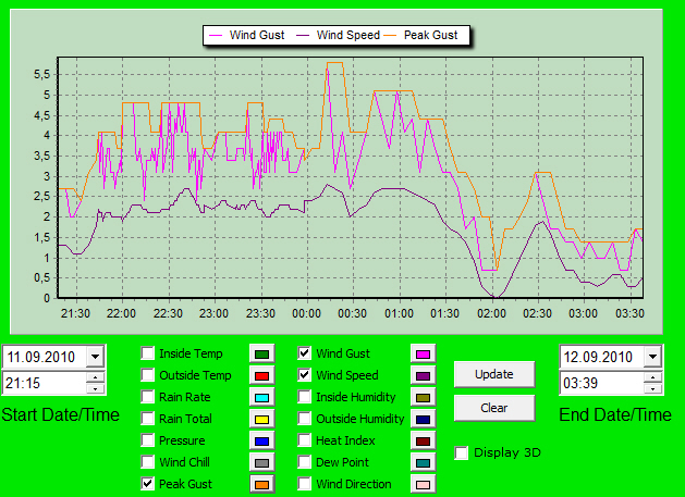 Im gestrigen Zeitraum von 21:30 Uhr bis 03:00 Uhr konnte ich bei einer mittleren Windgeschwindigkeit von 2,3 m/s eine Spannung von ca. 28 Volt feststellen. Wobei dieser Wert noch genauer untersucht wird, da ab diesem Zeitpunkt auch mein Windmaster seine Arbeit aufnimmt. Im gleichen Zeitraum wurde durch das EKM-2000 die MaxWerte von 59 Watt und 0,26 A ermittelt. Gesamtleistung in kwh noch 0,00 8-)