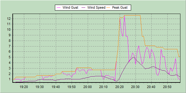 Also wenn das Wind Gust mal kurz auf 12m/s steht .... kommt das Windrad so schnell nicht nach. Ich würde so 8-9 m/s "schätzen" und die max. AC Werte im WM waren 394 Watt beim EKM 377 Watt und 1,61 A.