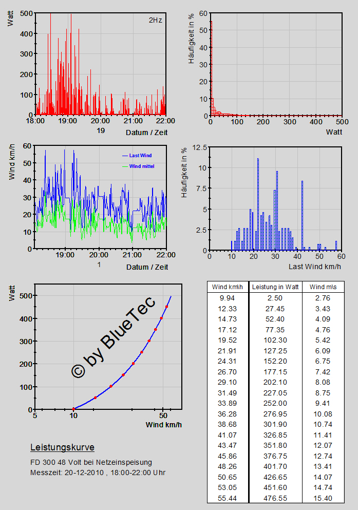Laut deinem Diagramm erreicht der FD 300 seine 500W bei 50 - 60km/h. Das kann ich nur bezeugen, da die Ampereanzeige am Laderegler heute mehrmals komplett ausgeschlagen ist.