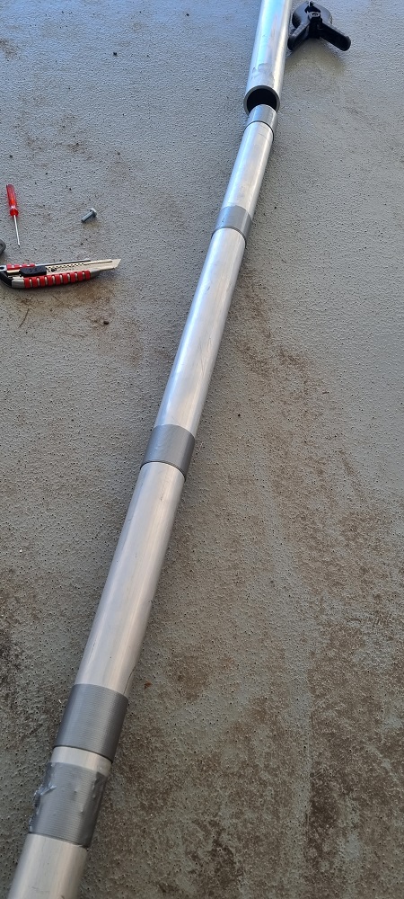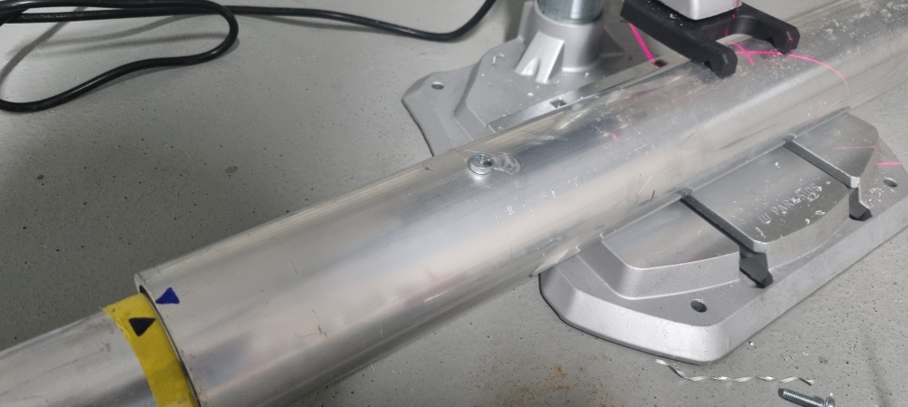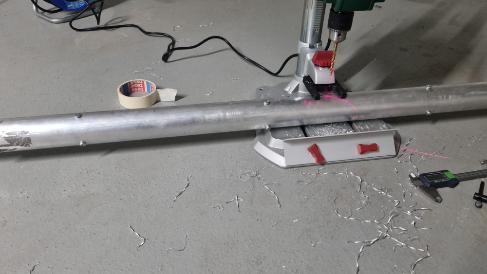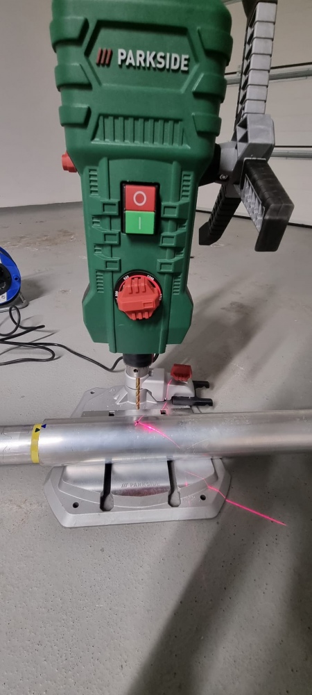 Entsprechend habe ich mir einen ca 1m langen Erdbohrer besorgt, ein humanes Loch für die Basis ausgehoben - und dann von hier ausgehend nochmal 1m tiefe Löcher gebohrt, wobei die äußeren etwa im 45° Winkel nach außen verlaufen.