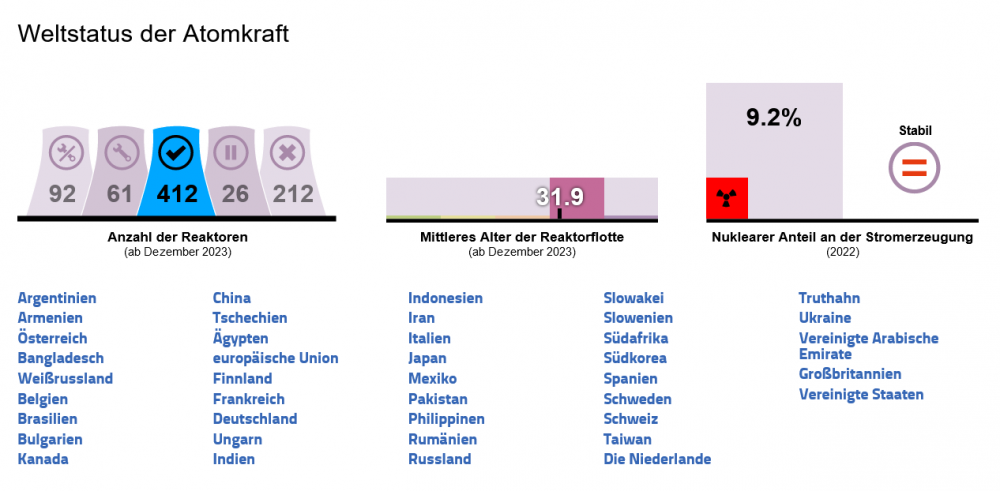 Im Jahr 2022 sind weltweit lediglich insgesamt sechs neue Atomkraftwerke ans Netz gegangen oder haben die erste Kritikalität erreicht. Fünf alte Atomkraftwerke wurden im selben Zeitraum abgeschaltet, die meisten davon in Großbritannien