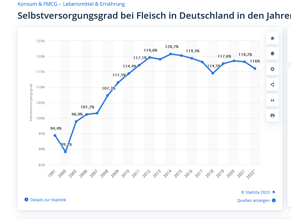 Und was den Fleischkonsum angeht, Deutschland ist da nicht gerade an der Spitze und die Schweine- und Geflügelhaltung wird eh schon aus dem Land vertrieben. Bei einem Selbstversorgungsgrad von sowieso gerade mal noch 90%, zumindest fand ich nur diese Zahl im Netz, weitere Flächen aus der Produktion zu nehmen verlagert das Thema nur ins Ausland. Hab da meine Zweifel ob das zielführend ist.