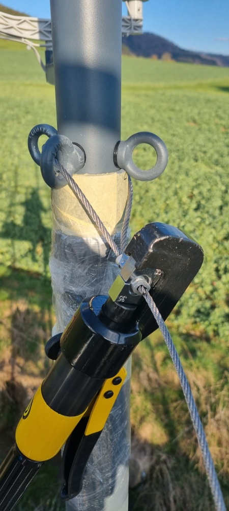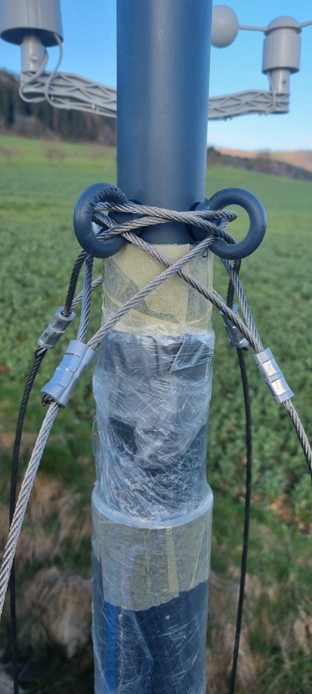 Zeitgleich wurden auch die Abspannseile angebracht. Um ein Ausreißen der Ösen / Gewinde zu verhinden, habe ich mich entschieden die Seile in einer Schlinge um den Mast zu legen. Das sieht zwar nicht ganz so hübsch aus - Aber aus Sicherheitssicht Vorteile: