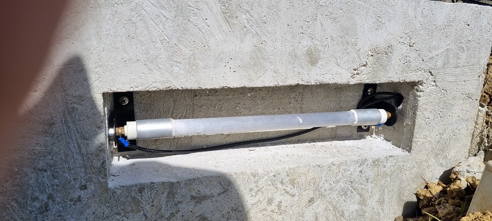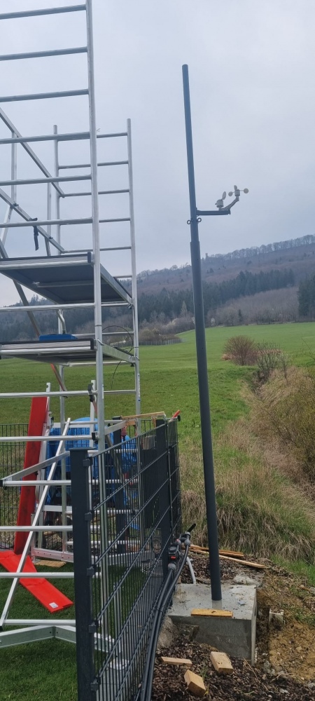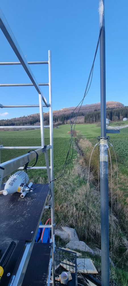 Wie bereits im Mast-Beitrag erwähnt, wurden zunächst die 3 Segmente der rohre, 3m, 3,15m und 3,3m ineinander geschoben, Kabel durchgezogen und dann aufgestellt. Aus der vormals geplanten Arbeitshöhe von 3,3m sind etwa 4,3m geworden, denn wir mussten feststellen, dass sich das Kabel für die Messgeräte sonst leider nicht einfädeln lässt: