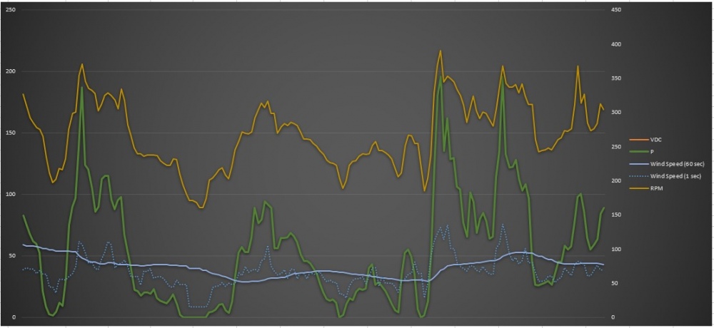 Mittlerweile habe ich die Kurve stark nach unten korrigiert, das erlaubt der Turbine jetzt auf 300,400 rpm zu kommen und Spannungen in höheren Bereichen zu liefern.
