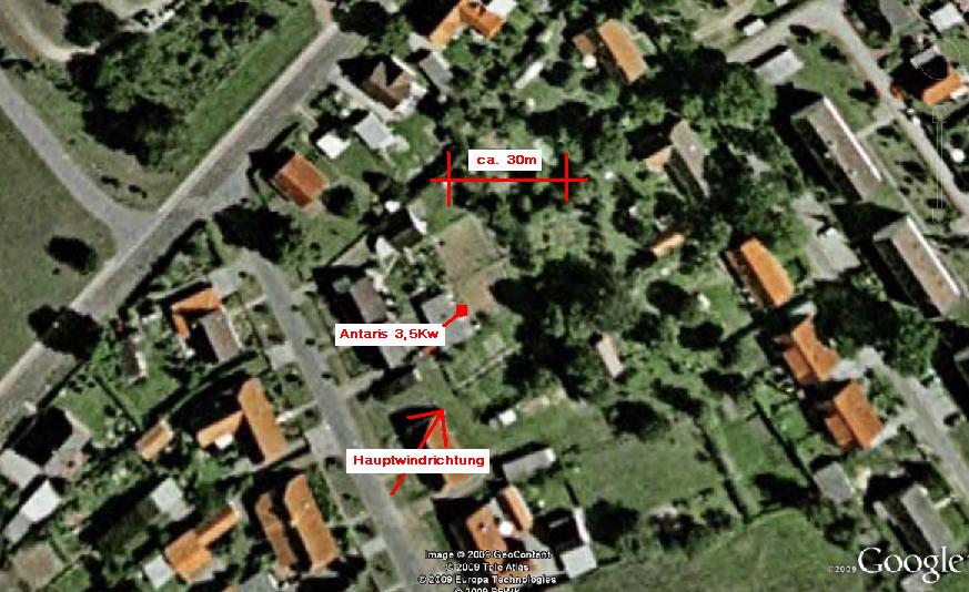 Der Standort; ist der Standort gut für ein Windrad (siehe GoogleBild)? Die Baumreihe rechts auf dem Bild ist ca. 30 m entfernt und hat eine Höhe von ca. 15-20m.