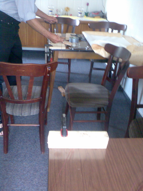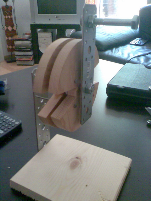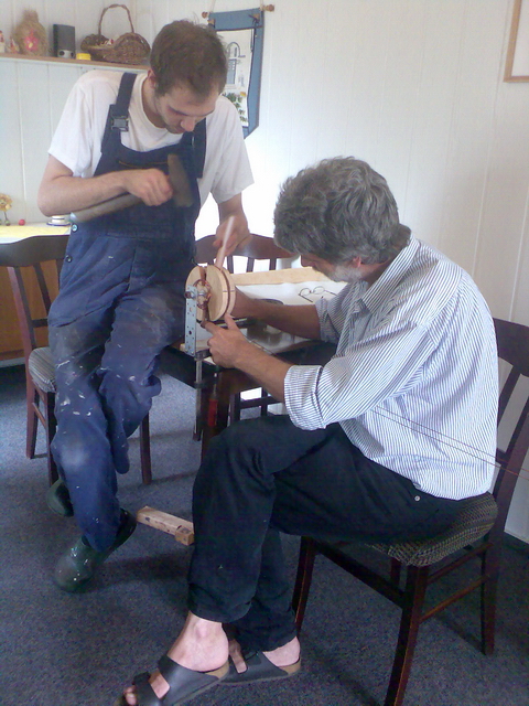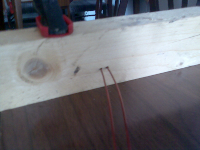 Der Durchmesser des Generators wird also etwas wachsen und die CAD Zeichnungen werden etwas abgeändert werden müssen. Die beiden Drähte haben wir durch einen kleinen Holzklotz geführt in den wir 1,5mm Bohrungen eingebracht haben. Dadurch gab es kein Vertüddern des Drahtes und gleichzeitig wurde er durch die Reibung am Holz sehr stark gespannt, was die Wickelei erleichterte und die Finger schonte. Dahinter haben wir die beiden Drähte durch einen Besen gezogen um eine gute Führung auch hinter der Wickelmaschine zu gewährleisten.