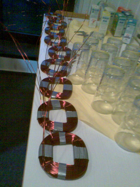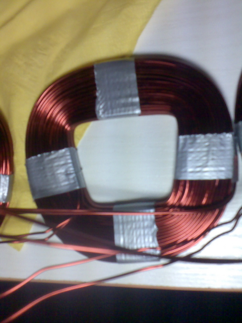 Jede Spule bekam 54 Windungen mit 2 Drähten parallel gewickelt. Laut unserem ständig seine Meinung andernden Messgerät beträgt der innenwiederstand EINER !!! Spule 0,3 Ohm...aber das glaube ich noch nicht, das kann so nicht stimmen (zu hoch). Mal schauen wie es aussieht wenn alles verkabelt ist.