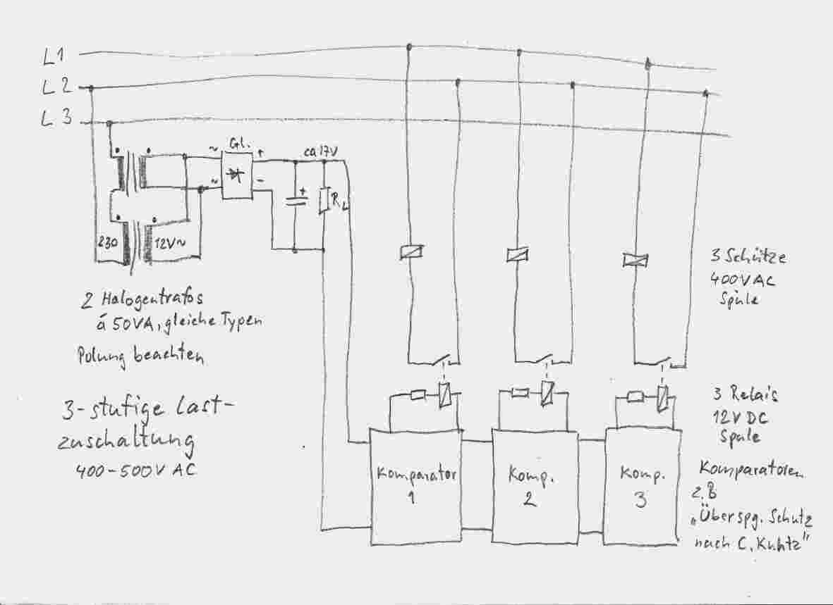 Zunächst mal die Frage, warum eigentlich 400-500V? Ist der Sternpunkt nicht zugänglich? Dann hätte man es nur mit 230-290V zu tun. An Relais und vielleicht auch bei Schützen kann man Rückstellfedern und Luftspalte zum Anker ändern, um zu den gewünschten Eigenschaften zu gelangen. Möglicherweise schalten sie dann schleichend und das gibt Kontaktabbrand. Eine fummelige Sache. Ich würde mir das nicht antun. Schon gar nicht bei den Leistungen. Ich habe drei Schaltskizzen angehängt. Die ersetzen viele Worte. Die Temperaturgesteuerte Variante fiel mir noch ein. Ra sind die Heizstäbe. Rs ist ein kleiner Shunt, der so bemessen ist, daß er mit 5-10W aufgeheizt wird. Rs ist mit einem Thermostat gekoppelt, der die nächste Stufe aktiviert. Vorteil: Langsam und kein Relais-Geklapper. Du kannst auch direkt die Temperatur des Heizstabes messen, aber ich vermute mal, daß die alle im selben Medium dümpeln. Dann geht das mit dem shunt gut. In der Skizze mit den 3 Komparatoren ist der Entladewiderstand Rl wichtig, damit die Spannung auch wieder zügig absinken kann. Probieren. Die Zenerdioden in der Kuhtz´schen Schaltung sind gegen Werte um die 15-18V zu ersetzen. Probieren.