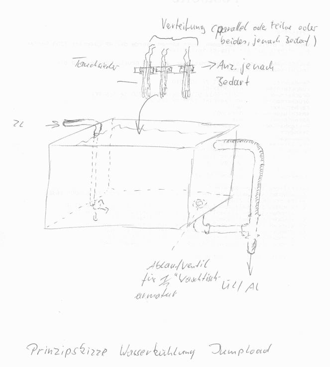 Die Widerstände wurden über eine Halterung direkt in einem Wasserbecken befestigt. An diesem habe ich einen Überlauf montiert und über einen Thermostaten und Wasserstandsmelder (parallel) und ein Magnetventil in 12V- Ausführung einen Wasserzulauf ermöglicht. Bei Temperaturen von unter 60° C ist ein Verkalken nicht so leicht zu erwarten, dies tritt hier nur in den Verdunstungszonen verstärkt auf. Ich habe mit einem Wassergrundvolumen von 10l gearbeitet, damit ich auch immer Frischwasserzulauf habe und nicht manuell sooft wechseln muss (STINK). Der Thermostat spricht daher bei mir schon bei 35°C an und das Durchlaufvolumen ist auf 0,1l/min beschränkt, damit nicht zuviel Wasser verschwendet wird und die Reglung auch einfach und langsam arbeiten kann (Kapillarthermostat). Zulauf nach unten legen und gegenüber dem Überlauf (manuelle Entleerung nicht vergessen!!) Bei entsprechender Dimensionierung lassen sich hier leicht und billig (Spiralen aus Wasserkochern gehen auch) Hochleistungswiderstände bauen. Diese Variante ist für Leute geeignet die den Shunt nicht in einen Boiler einbauen können um warmes Wasser zu erzeugen. Jedoch kann hier ja noch einiges „dazuerfunden“ werden.