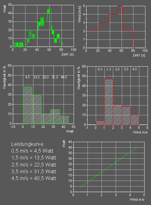 Mich beschäftigt die Frage, wie ich am besten eine reale Leistungskurve erzeugen kann, wenn Leistung mit 2 Hz und Wind alle 48 sec abgetastet werden. Hierbei stellt sich aus meiner sich die Klassierung der einzelnen Werte als Weg zum Ziel dar. Meine simulierten Generator und Winddaten habe ich in je 5 Klassen (besser mehr) eingeteilt, wie nachfolgend ersichtlich ist.