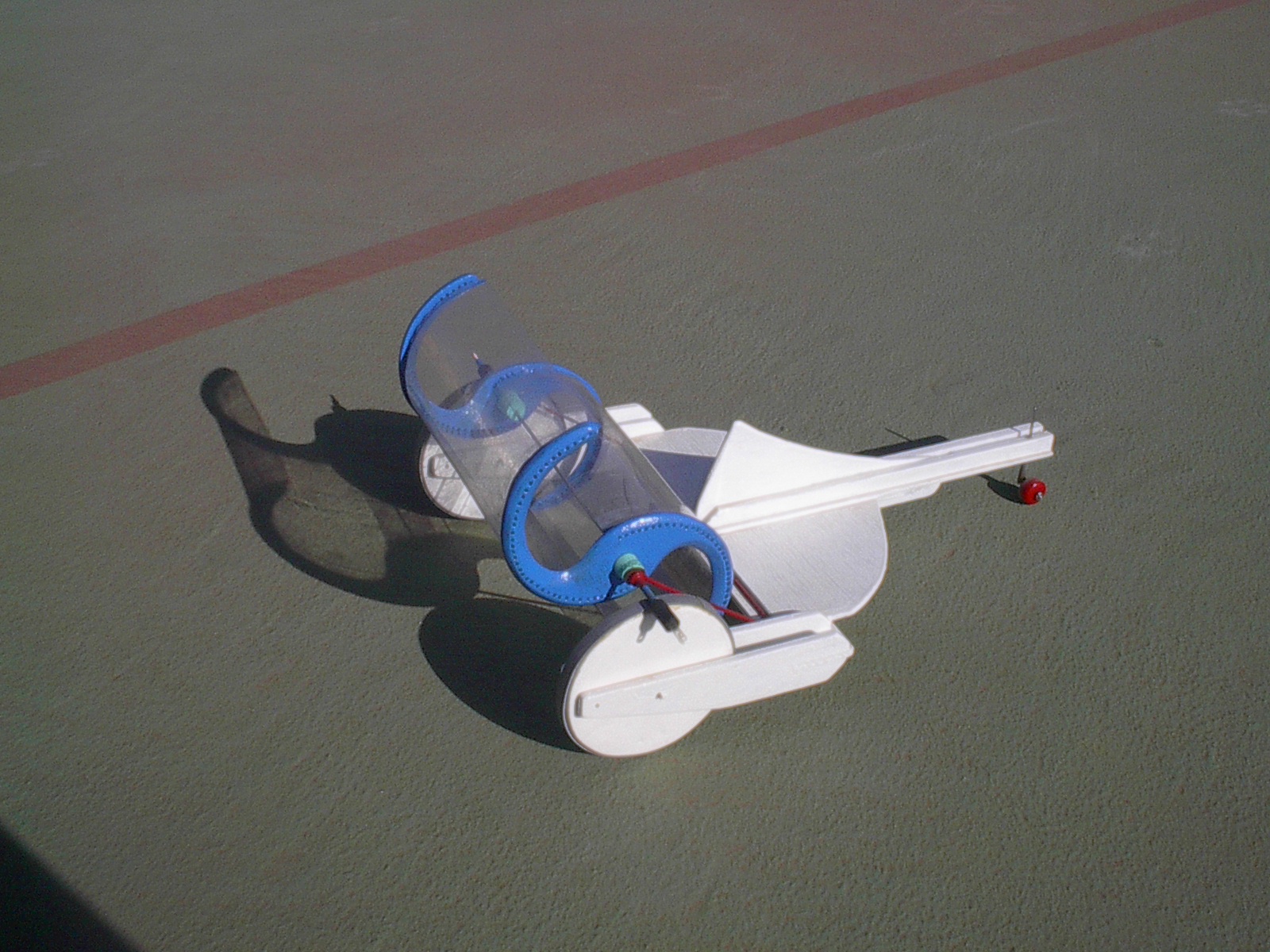 ich wollte Euch den Savonius mal ganz anders vorstellen. Als Antrieb für ein windgetriebenes Miniaturfahrzeug. Man kann damit gegen den Wind fahren, wer´s nicht glaubt, kann es nachbauen und selber versuchen. Der Rotor liegt hier mit seiner Drehachse waagerecht und treibt direkt über die Achse die Hinterräder des Modells an. Dies wurde von mir vor zig Jahren gebaut, weil ein Physikprofessor (an einem Institut für die Physik der Mechanik) sich bei mir darüber beklagte, dass sein Fahrmodell mit vertikaler Drehachse zuviel Reibung in der mechanischen Umlenkung auf die Räder hatte, um gut genug gegen den Wind fahren zu können. Seht hier das Foto: