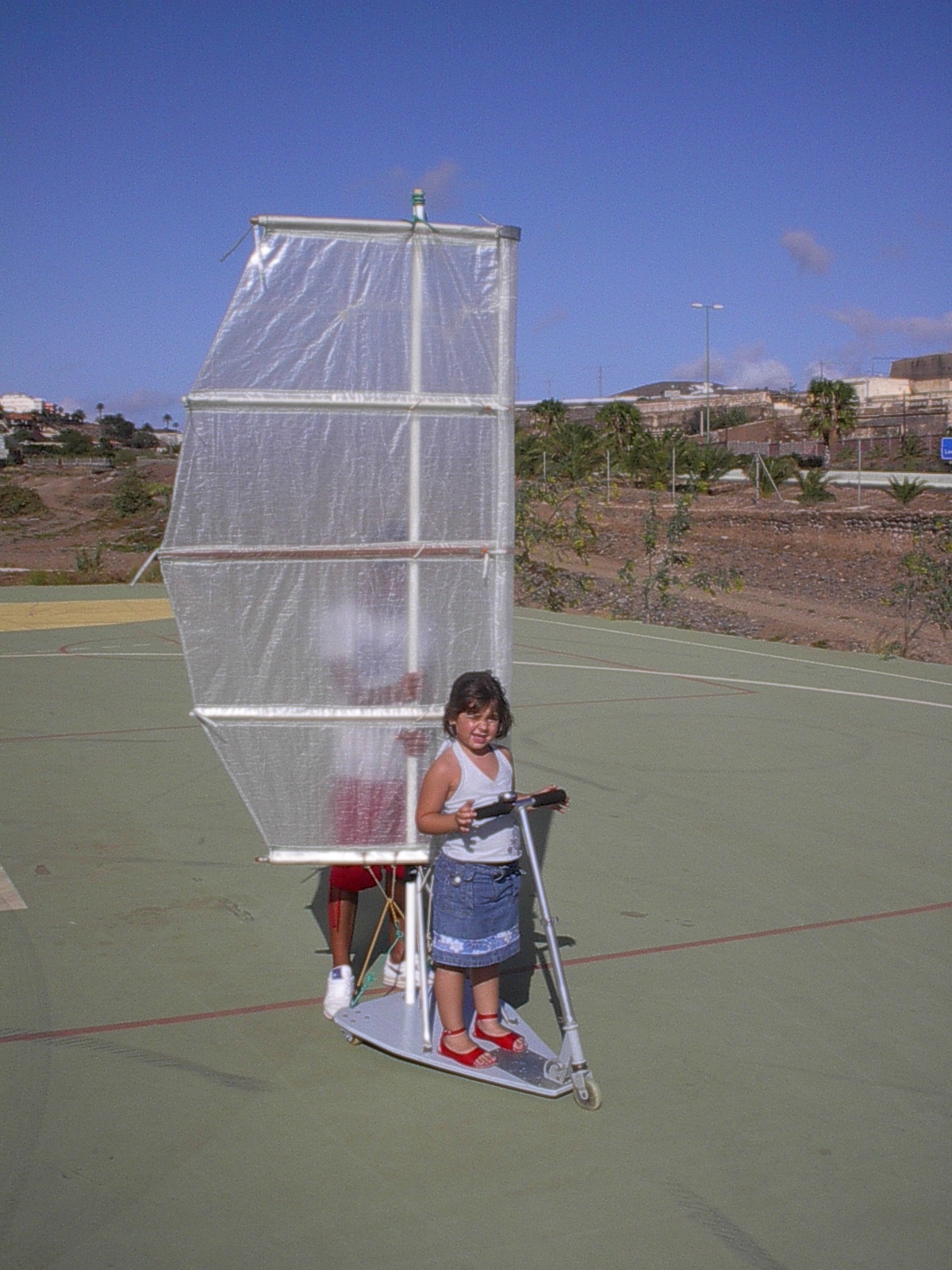 und hier noch besser für die Jungs vom Gymnasium - bei einem Lastenfahrrad mit Segel hinterm Fahrersitz, sehr leicht beherrschbar, weil man den Schwerpunkt mit dem Hintern prima gut verlagern kann. Absolute Beherrschung des Gleichgewichts möglich, geh auch superleicht zu manövrieren. Allerdings nur mit Luggersegel wie bei der Piratenjolle o.ä., der Mast möglichst weit hinten, so dass der vorstehende je nach Windrichtung frei schwingende Segelteil vor dem Mast nicht in Körperberührung mit dem Kapitän kommt. Luggersegel kann man so festsellen, dass sie sich wie das Djunkensegel automatisch bei Richtungswechseln an den Wind stellen, man muß nur lenken und mit dem Po ordnungsgemäß und zivilisiert das Gleichgewicht ausbalancieren. :