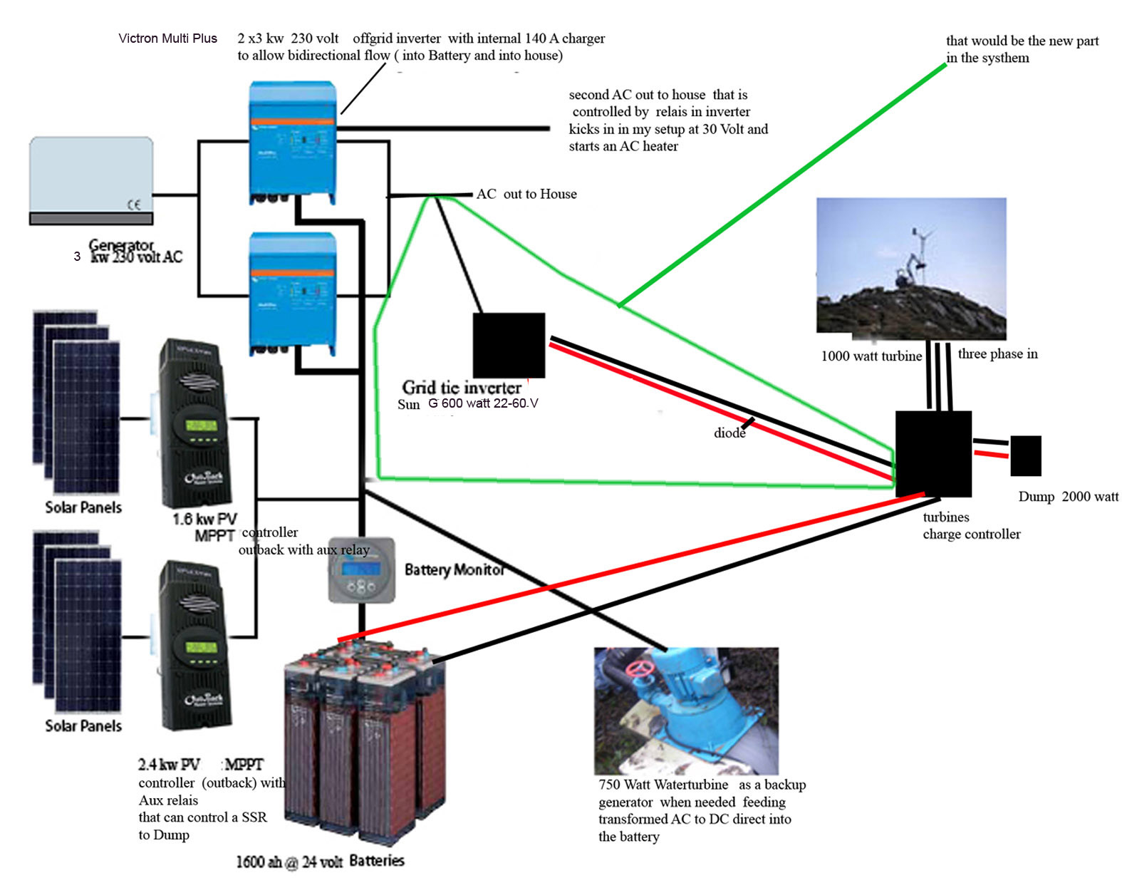 Hier ist meine Anlage muit GTI am Ausgang des Victron Multi Plus ..... der GTI hat zwar nur 600 watt max , laed aber rueckwerts auch mit da er ins Ladeteil vom Victron mit einspeist , waehrend er gleichzeitig die Verbraucher im Haus bedient , in meinen Fall koennte ich auch bis zur Ladeleistung von ca 4000 Watt meiner Victrons mit Gristie Inverter arbeiten , waehrend die Mppt PV Laderegler ja die Batterie eher direkt laden
