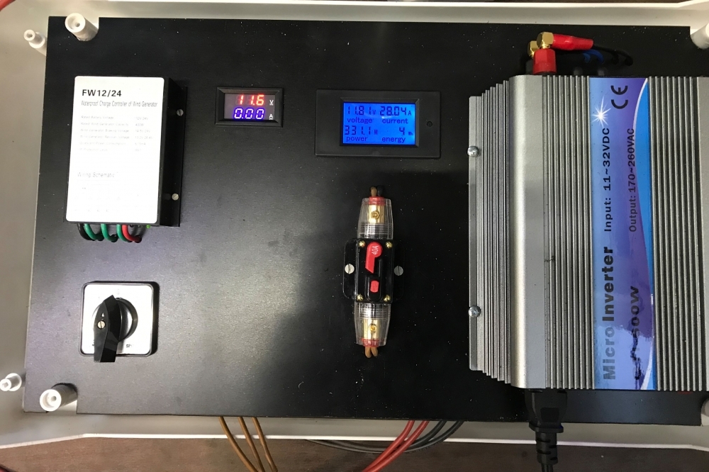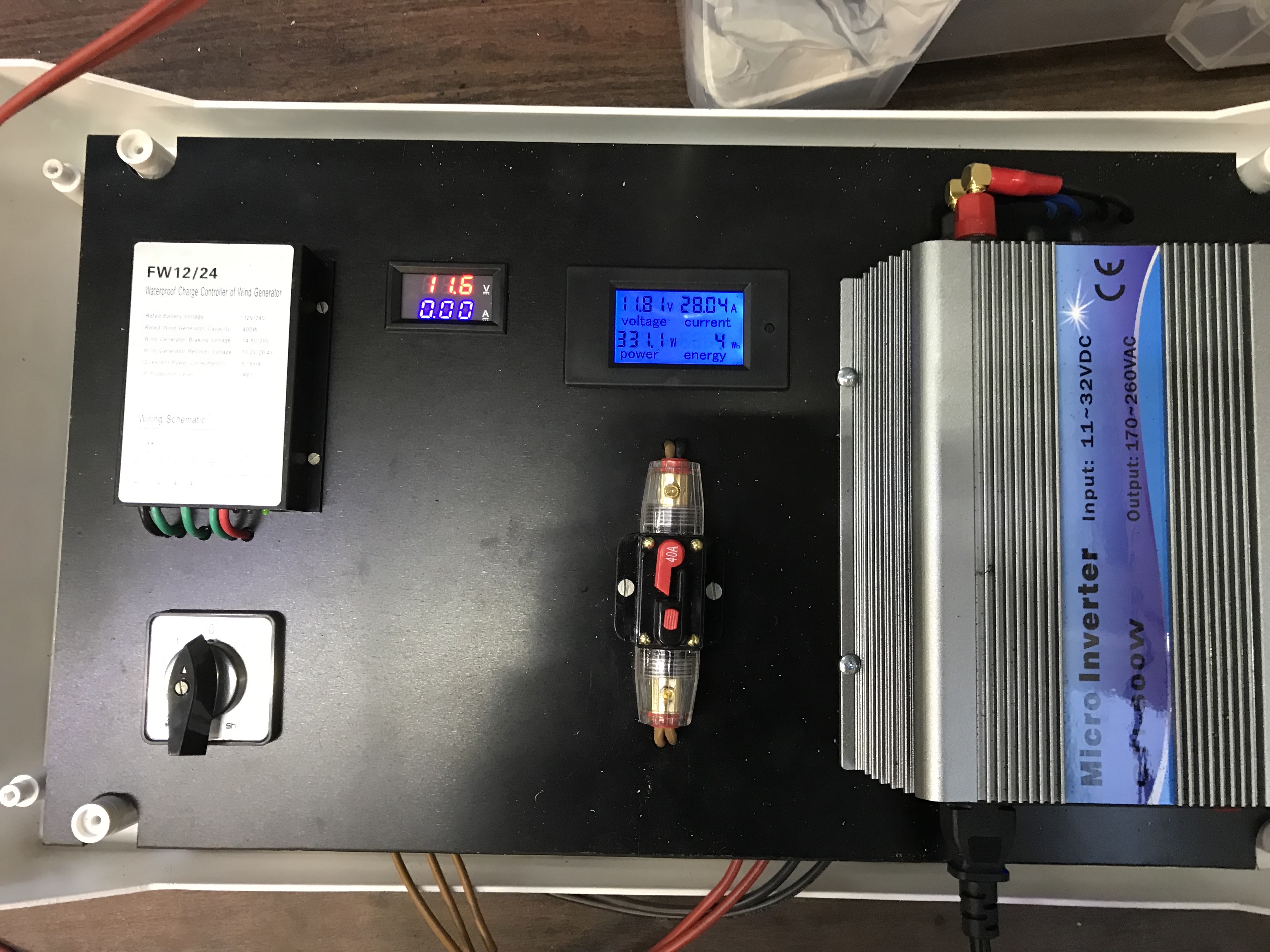 In ca. 30m Entfernung steht eine kleine Holzhütte, darin habe ich eine kleine "Schalttafel" installiert. Mit Laderegler, Umschalter auf Kurzschluß (Sturm), Batterie und Platz für einen Wechselrichter, mit dem ich u.U. in eine Phase meines Hausnetzes einspeisen kann.
