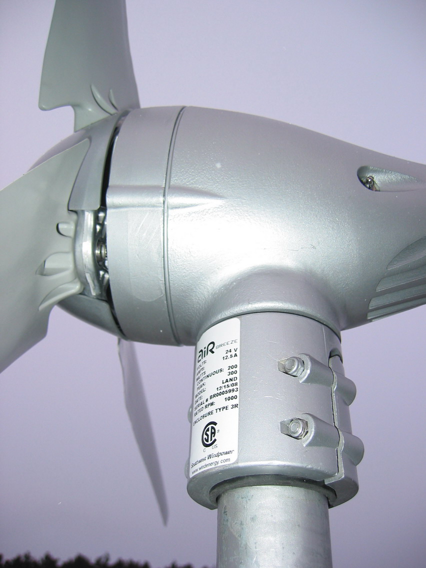 Die Angaben am Windrad: 300 W, 12 V, 12m/s